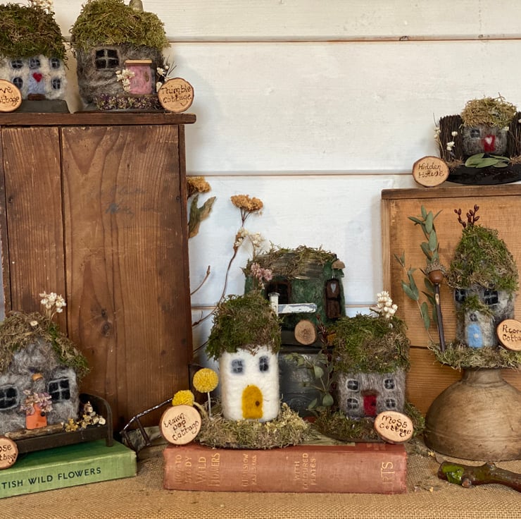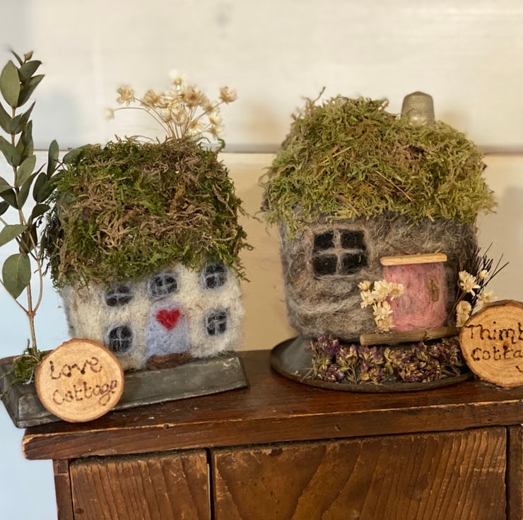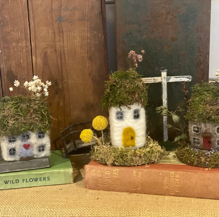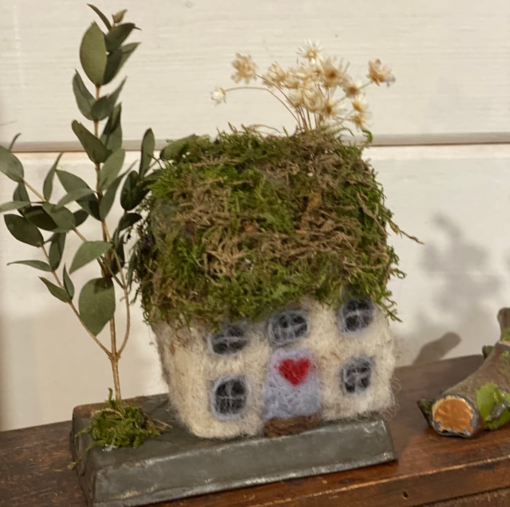 Needlefelted little wonky cottage, made from english wool, moss roof and dried flowers. Displayed on a vintage pastry tin