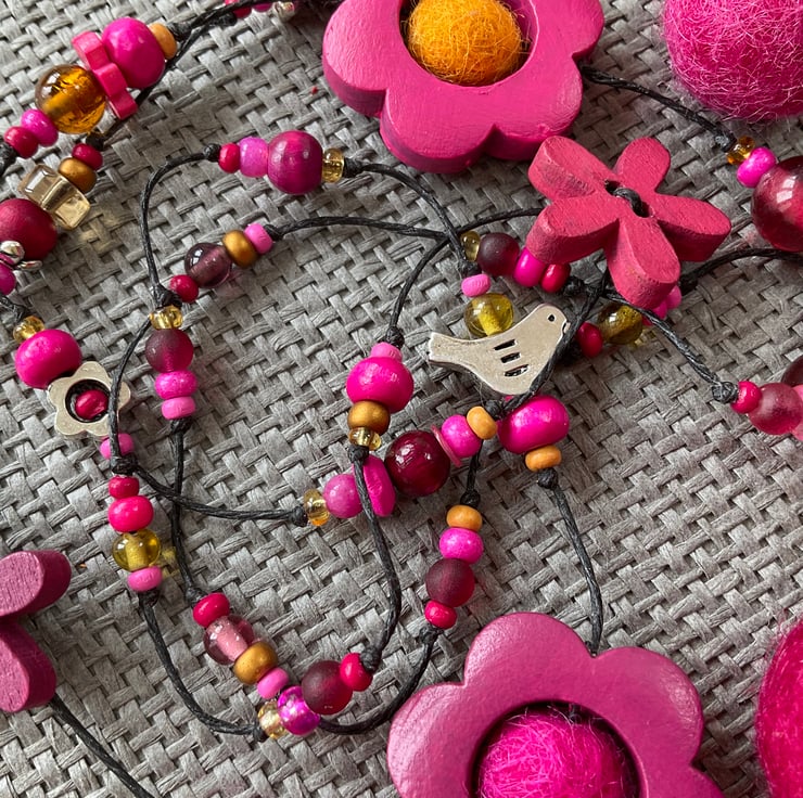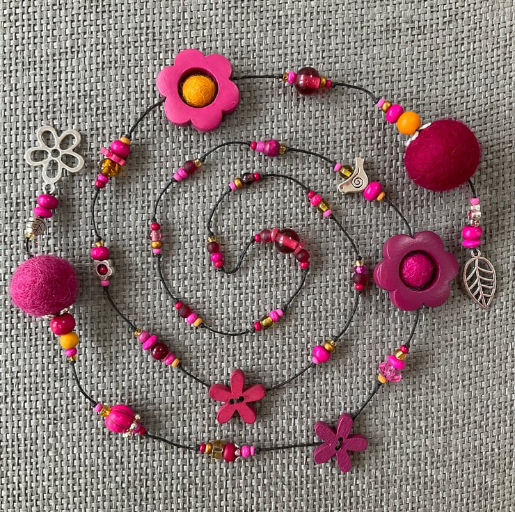 Lariat necklace featuring a glorious mixture of beads in shades of pink, with a touch of sunflower yellow here and there. The beads include large and small painted wood flowers, felt balls, glass and wooden beads, as well as antique silver tone bird, leaf and flower beads.