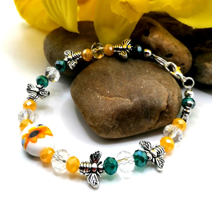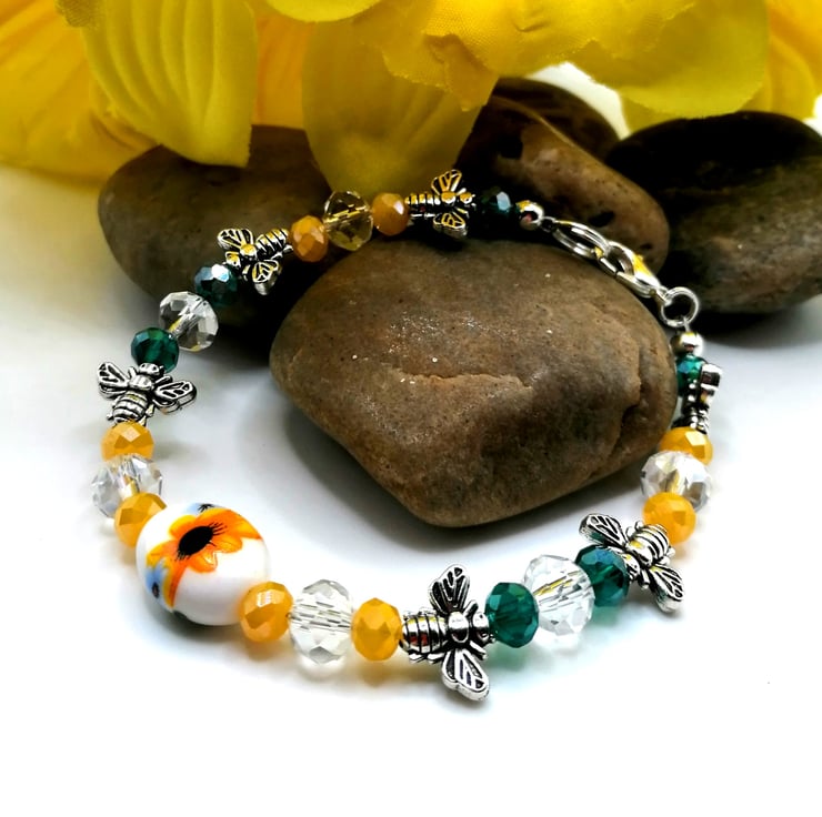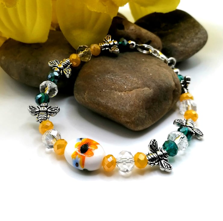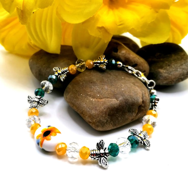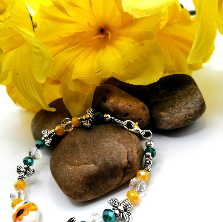 This wonderful bracelet is made from a central, ceramic, sunflower bead. The other beads are glass and silver plate. This pretty bracelet is made with 8mm and 6mm all glass beads. Please leave me a message with your choice of length. If I don't receive a message I will send as pictured.
