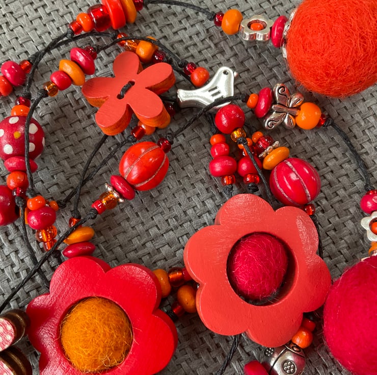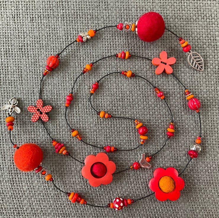 Lariat necklace featuring a glorious mixture of beads in shades of red and orange shades. The beads include large and small painted wood flowers, a polka dot flower, felt balls, glass and wooden beads, as well as antique silver tone bird, butterfly, ladybird and flower beads.