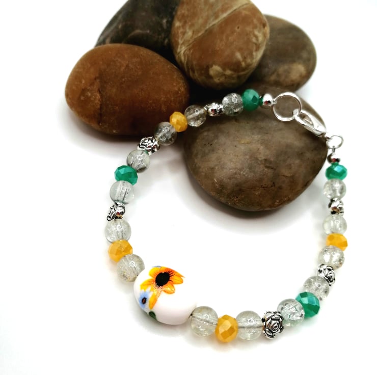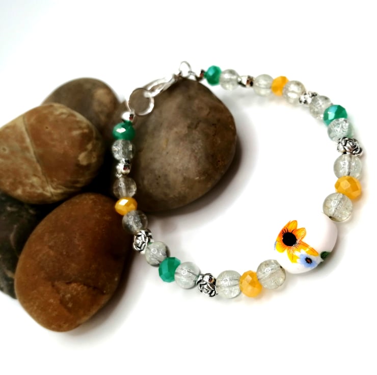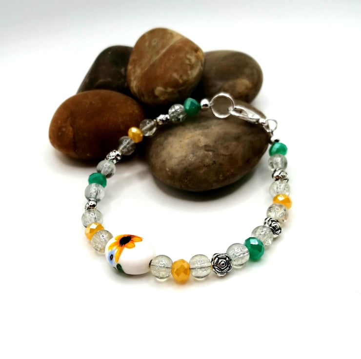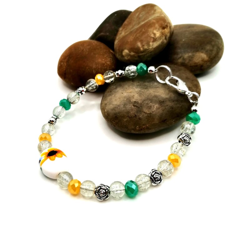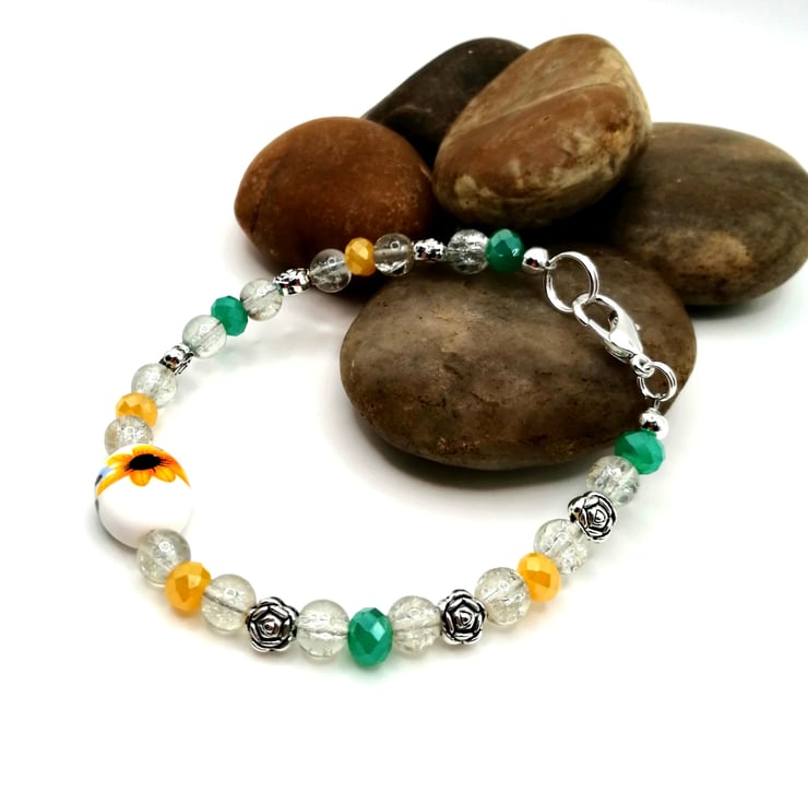This unique bracelet is made from a central, ceramic, sunflower bead. The other beads are glass and silver plate. Please leave me a message with your choice of length. If I don't receive a message I will send as pictured.