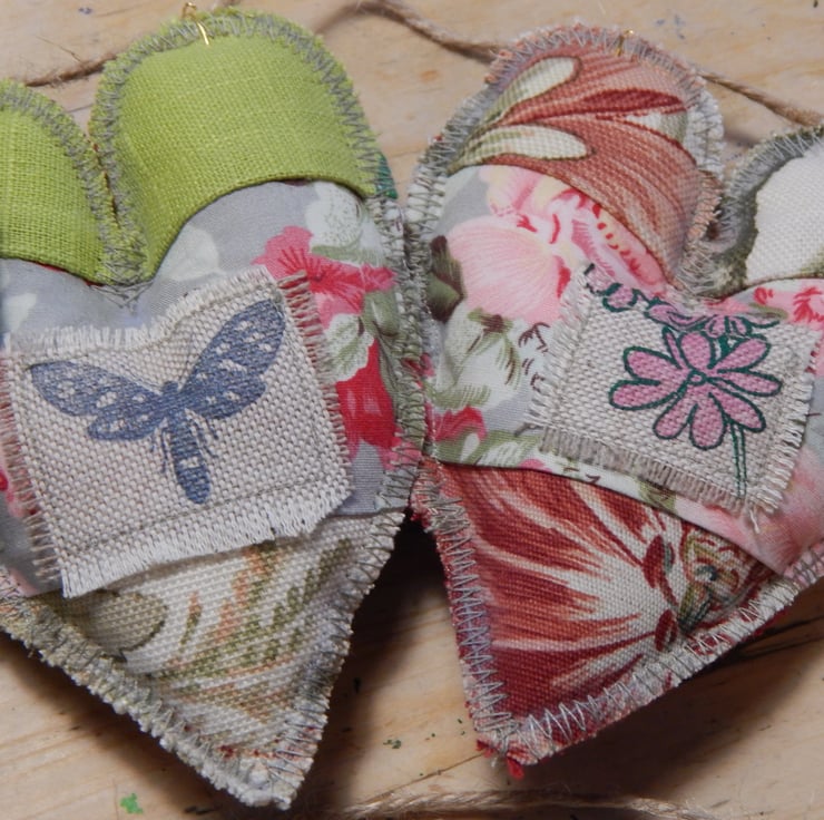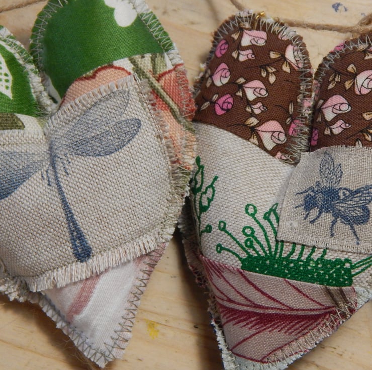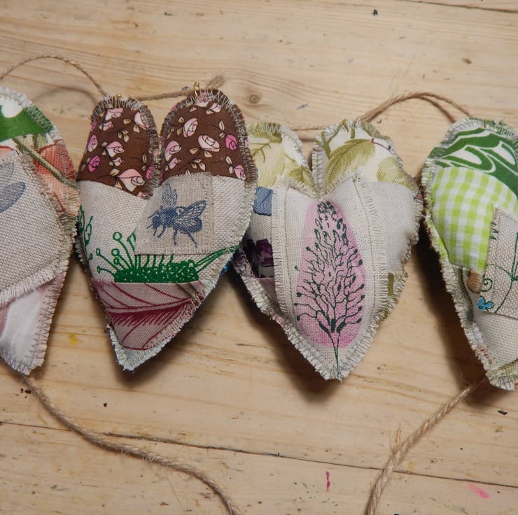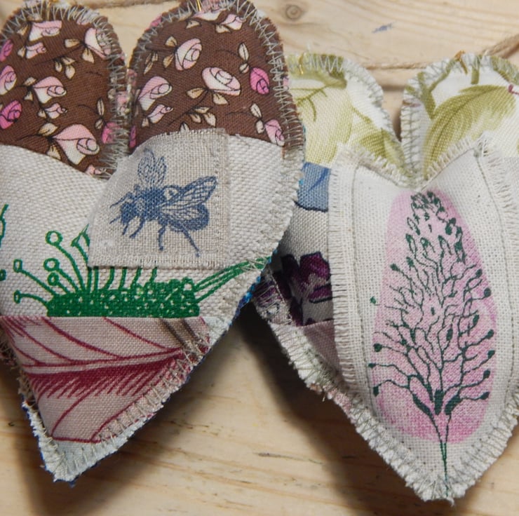 There are 7 hearts, 7 measuring approximately 11cm by 8cm. The hearts are patchwork and have various gardening things appliqued on to them. There is an appliqued screen printed hoary plantain, bee and moth.
