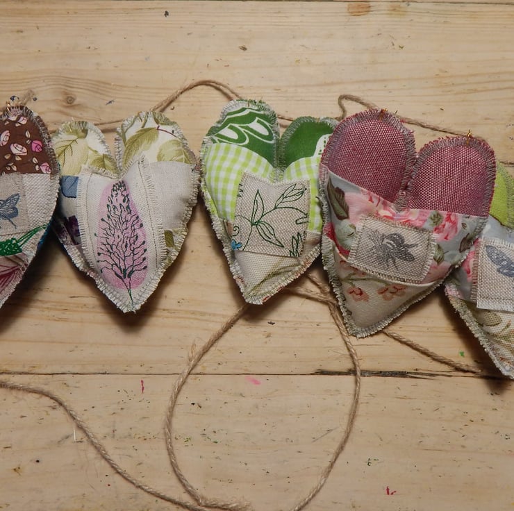 This is a wall hanging/bunting that measures 70cm from heart to heart with at least 30cm of jute twine at each end to hang with. The reverse of the hearts is a patchwork of fabric.