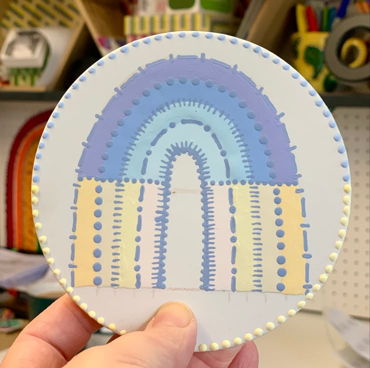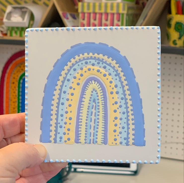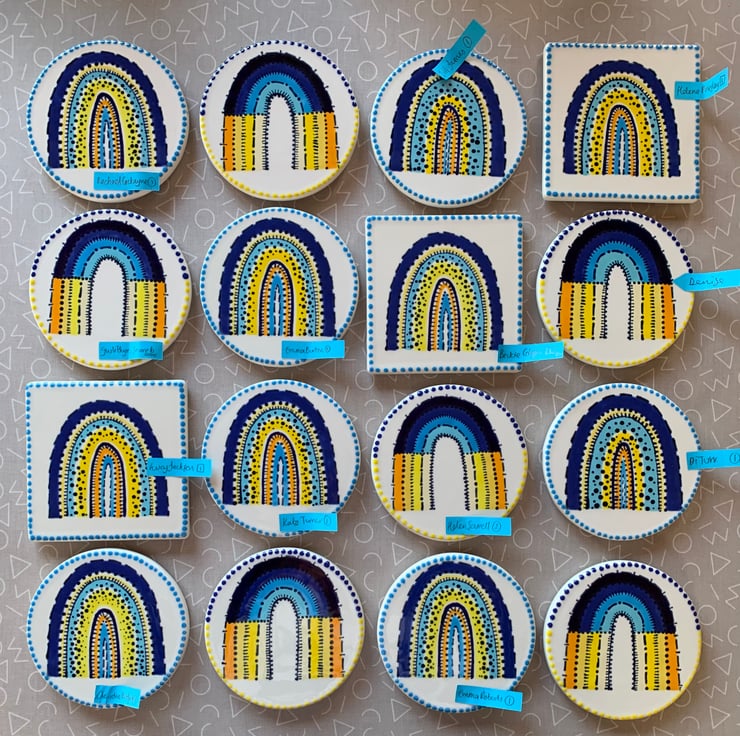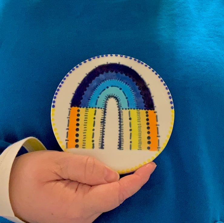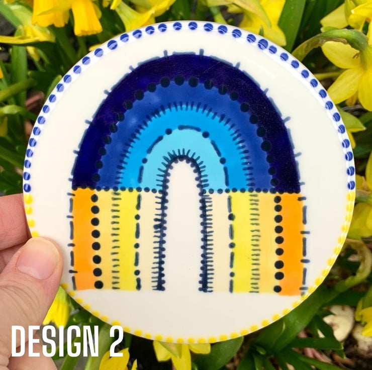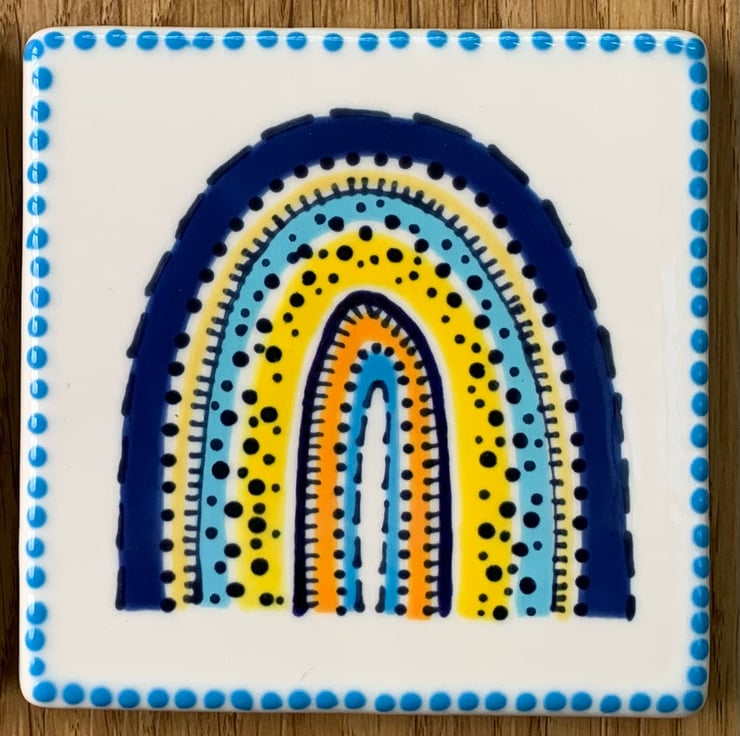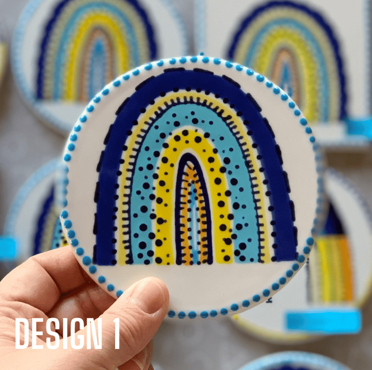 Each rainbow is hand painted on to a white earthenware coaster and available in either a round or square coaster shape. Painted in a combination of Blue & Yellow underglazes there are two unique Ukraine rainbow designs available: Mixed Blues & Yellows and a half Blue, half Yellow rainbow with a nod to the Ukrainian Flag.