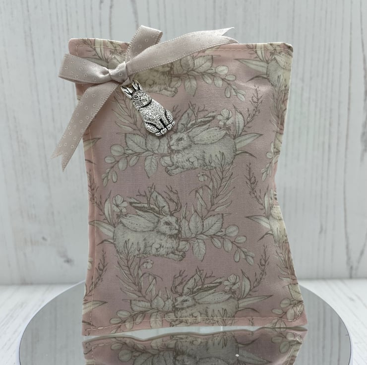 A beautiful rabbit design printed onto fabric on my inkjet printer. The backing is a complimentary print of blue dots on Ivory. Taupe spotted satin bow and a rabbit charm. Filled with Hampshire lavender grown in my garden.