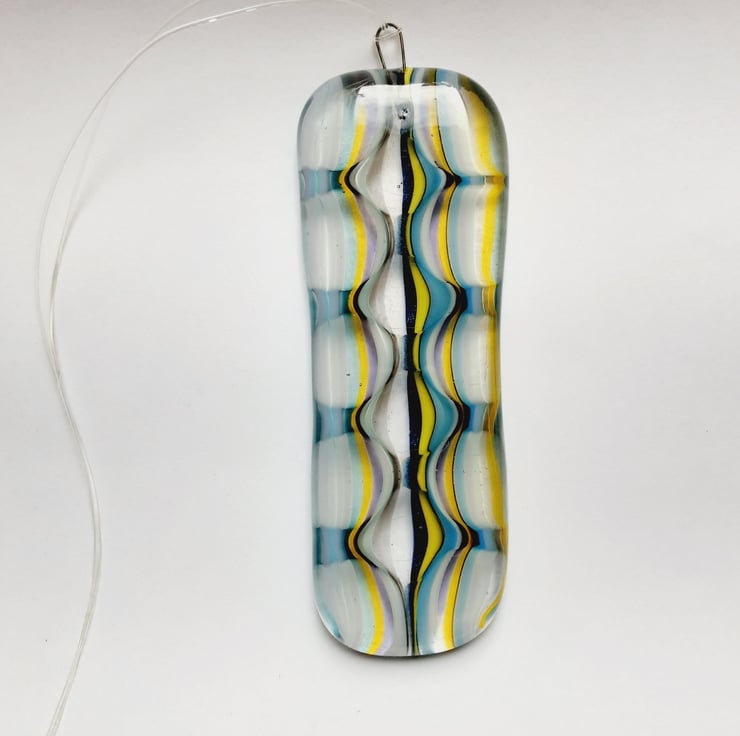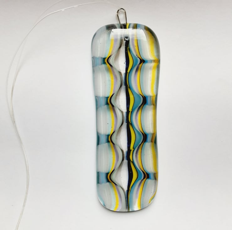 A striking suncatcher which been made using stringers and the optic technique. I've fused a high temp hook into the glass so it can be hung easily.
