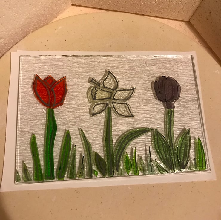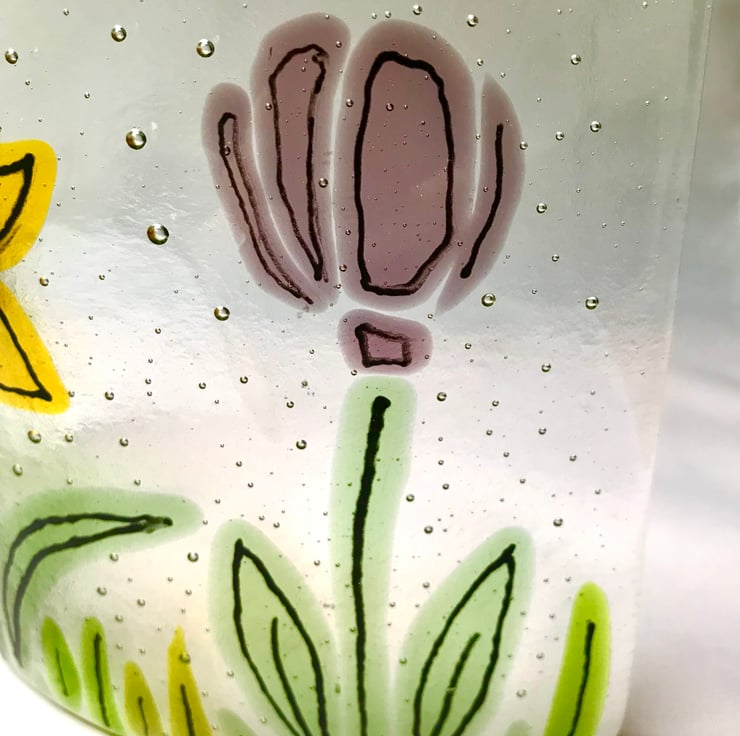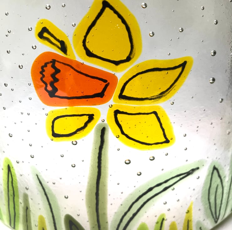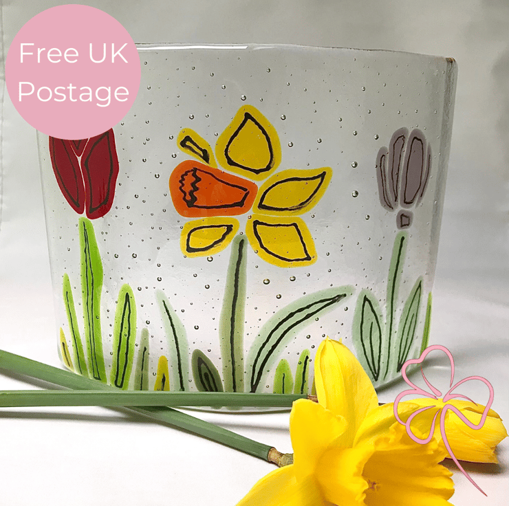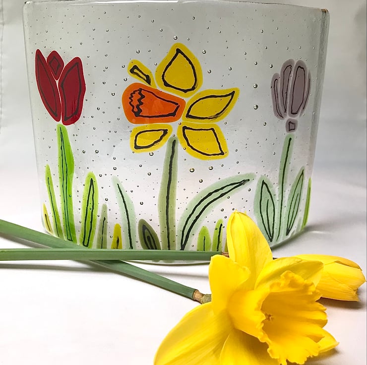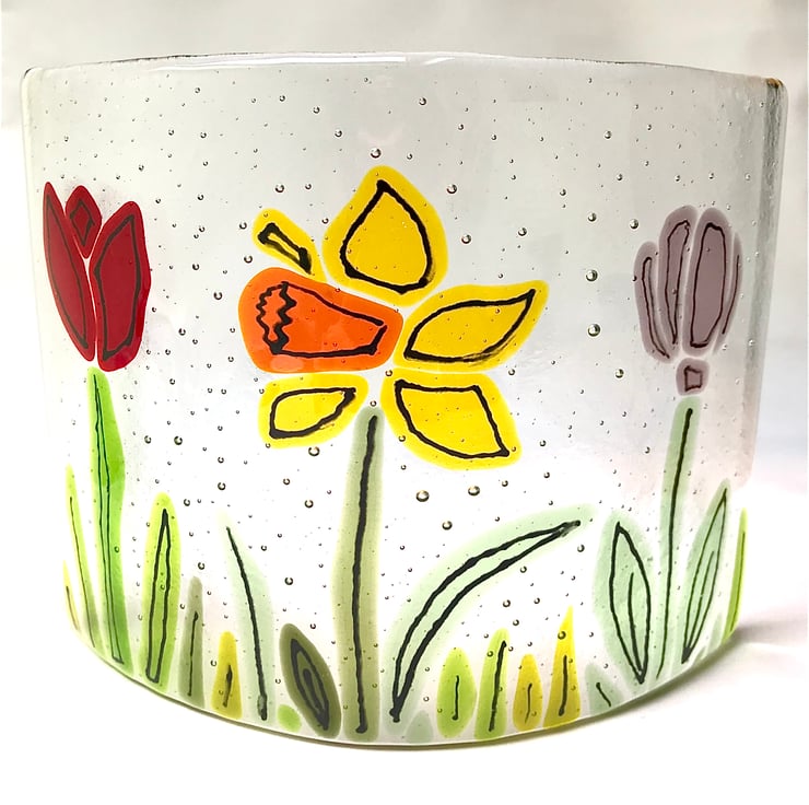 Brighten your space with this one-of-a-kind fused glass flower screen, featuring a cheerful spring garden design with a tulip, daffodil, and crocus in a charming, cartoon-style composition. Each element is hand-cut and hand-painted, then fused onto two layers of clear glass to create a vibrant, light-catching piece that’s perfect for windowsills, shelves, or as a unique gift.