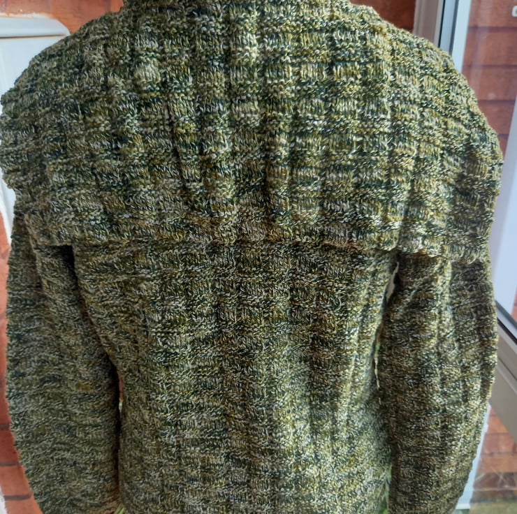 Hand knitted cardigan/jacket knitted in a basket weave stitch, the cardigan is knitted in a variegated green easy care yarn which can be machine washed, and is 20% wool 80% acrylic mix.