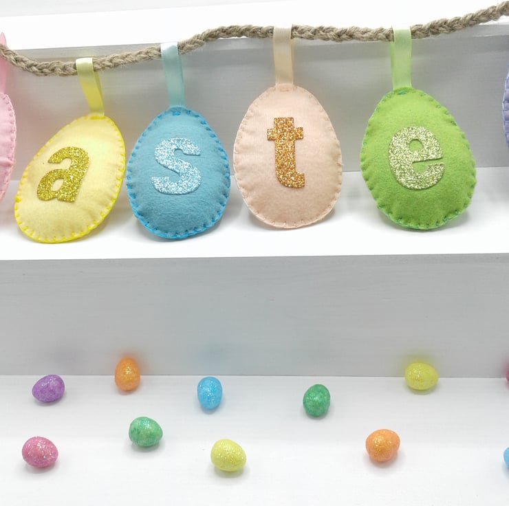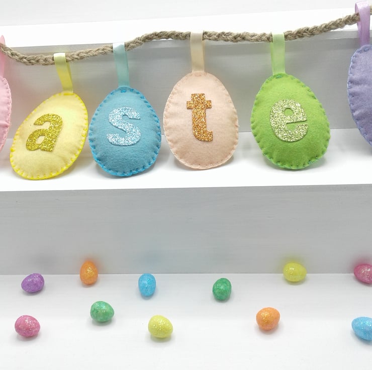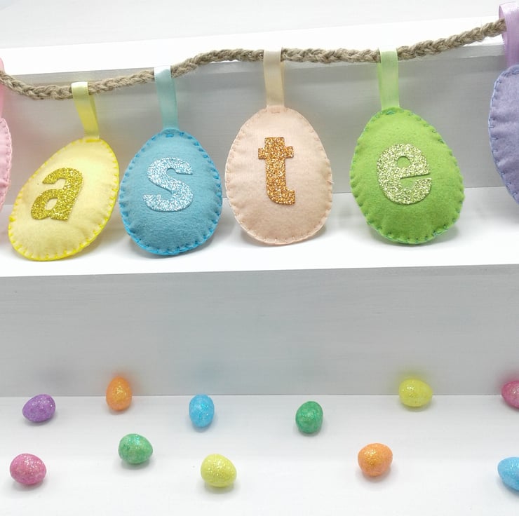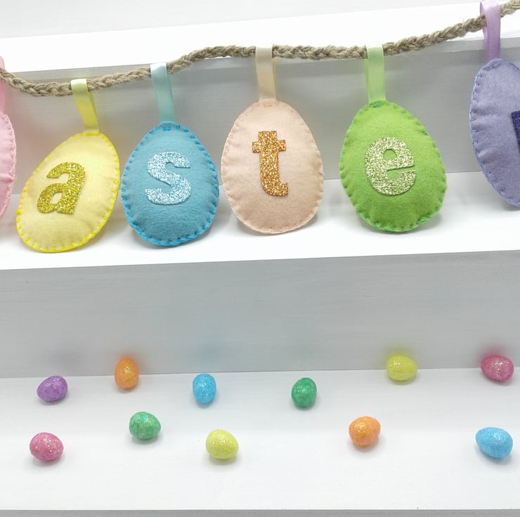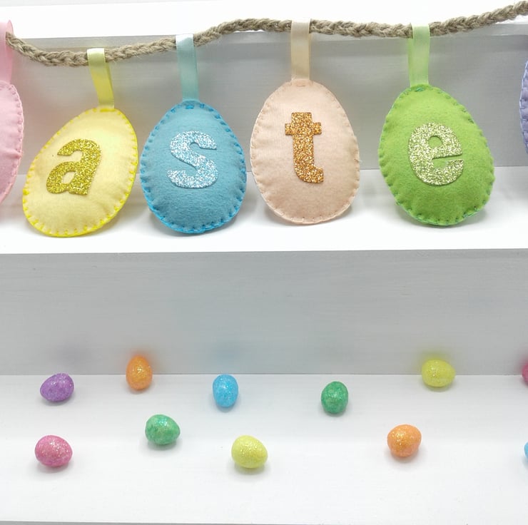 Comprising of felt eggs decorated with glitter fabric letters.