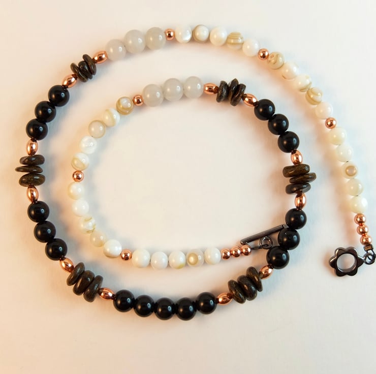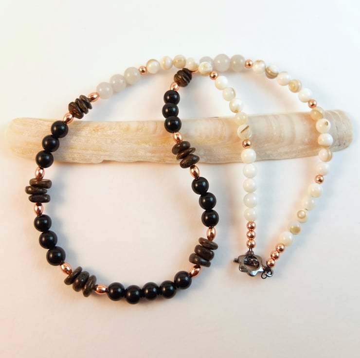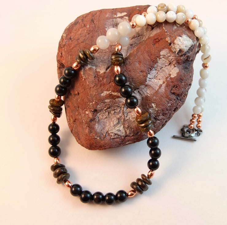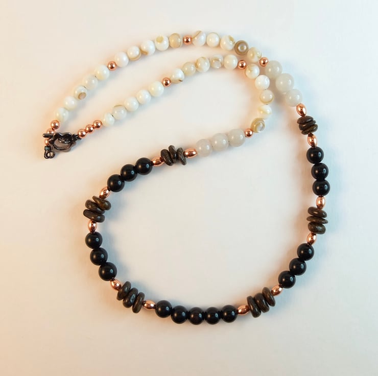 The necklace graduates to 6mm light grey jade and 5mm cream shell beads with lovely glints of mother-of-pearl, and is further embellished with small, round, copper beads, adding warmth and shine.