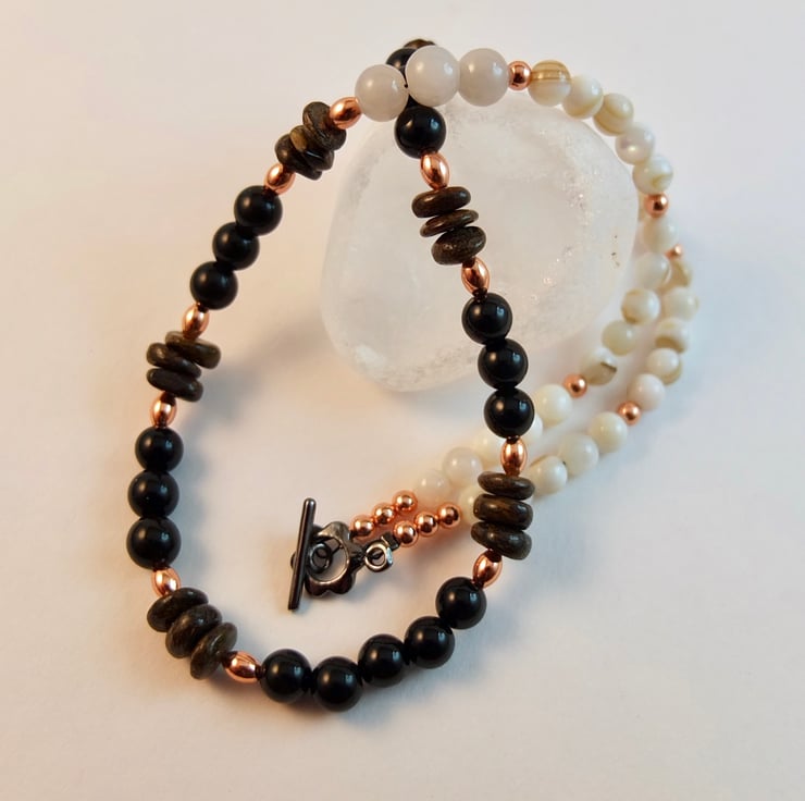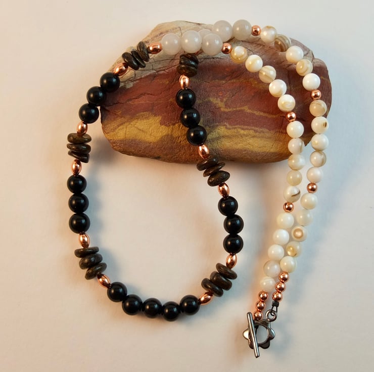 Bronzite has warm, brown earth tones and a metallic lustre that works well with these shiny copper beads