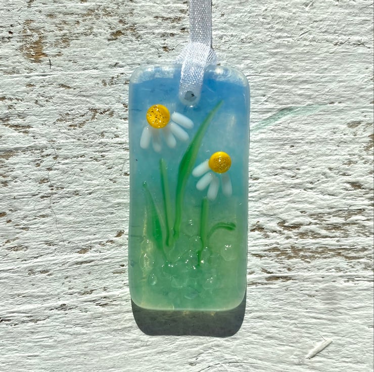 A lovely handmade card with a ‘mini meadow’ fused glass hanging with two daisies on attached to it - the perfect card and gift in one!