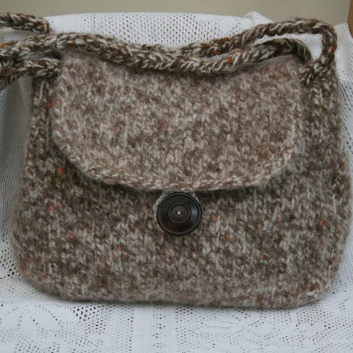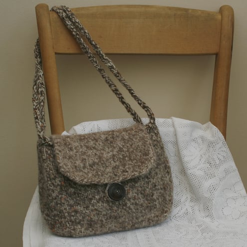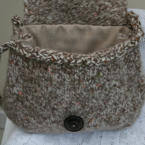 The yarn is a pure wool in a flecked 'tweed' effect. The main colours are a soft mushroom brown and cream with flecks of apricot and lime green. The main body of the bag is lined with beige fabric. The straps are formed from one long plait, constructed from three crocheted braids in the same yarn as the main body of the bag. The plait is then stitched in place across the top of the front of the open bag, the ends are then crossed over each other and fastened in place at the base of the flap (each on the opposite side of the bag) to give double handles. The bag closes with a loop over a button. The loop is crocheted in a coordinating yarn.