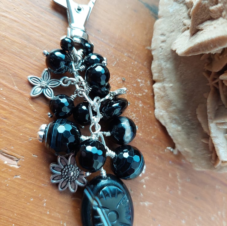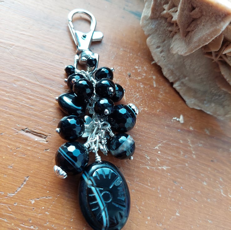 The bag charm or key ring, it works equally well as either, is made up of round beads of black stripe agate, an oval carved bead and sliver-plated charms, clustered on silver-plated chain. It has a total length of 11cm, including the clasp. It makes an ideal gift for mum.