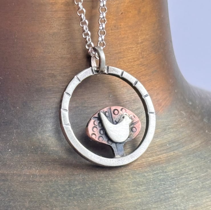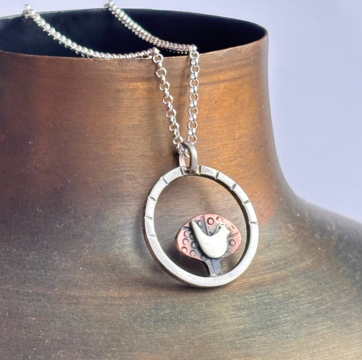 A lovely silver and copper necklace featuring a hand cut copper tree with a little silver bird set within a sterling silver circle. The metal has been textured, oxidised and rubbed back for depth. The pendant is hung from an 18 inch sterling silver chain.