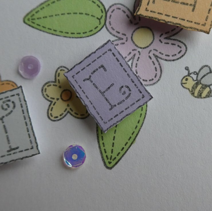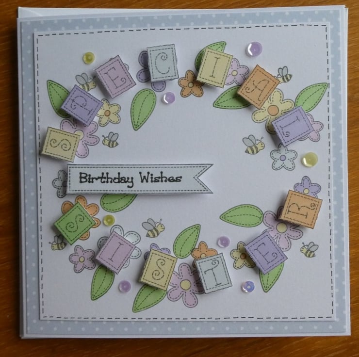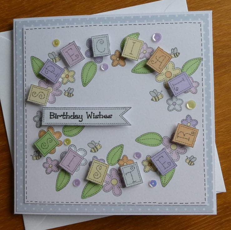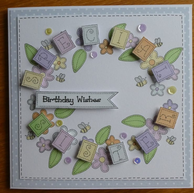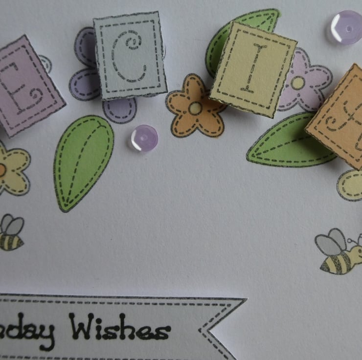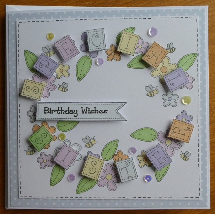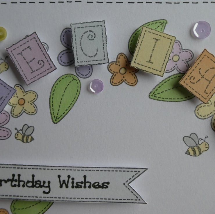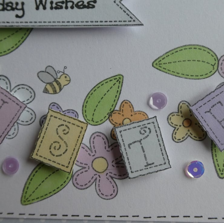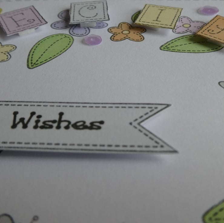 Pastel sequins and a banner style message with the greeting Birthday Wishes have then been added to complete the design,