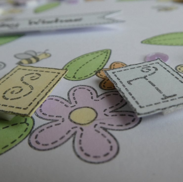 This hand stamped and coloured birthday card has a design of flowers, leaves and bees in a circular pattern. The images have a faux stitching detail and have all been hand coloured in pastel shades.