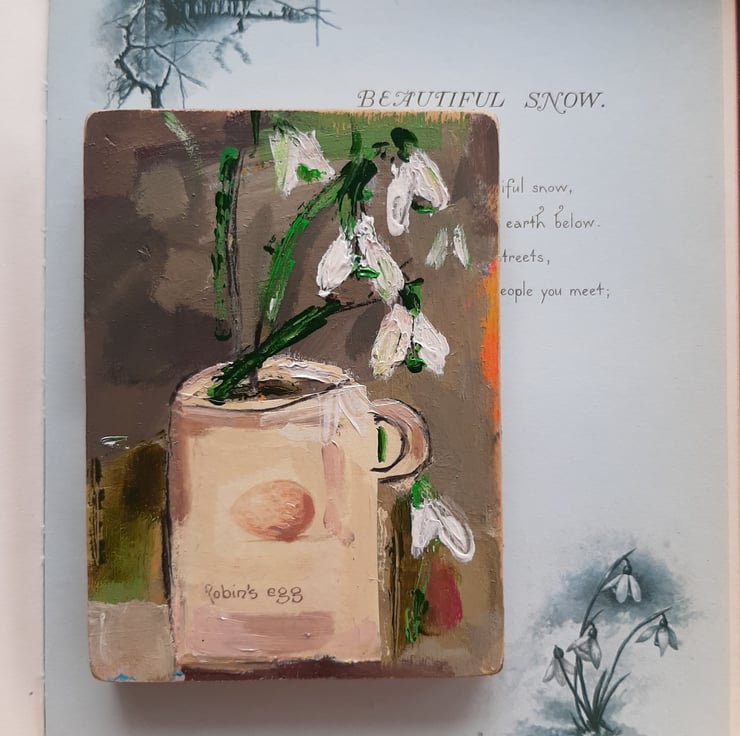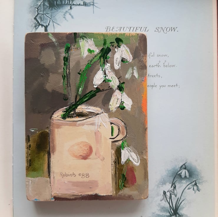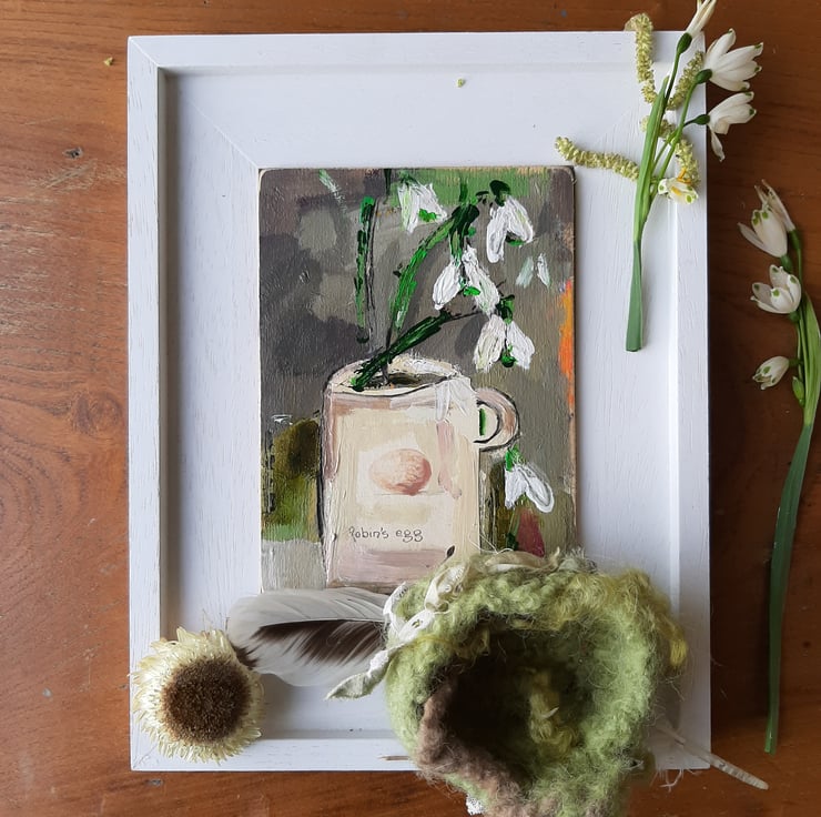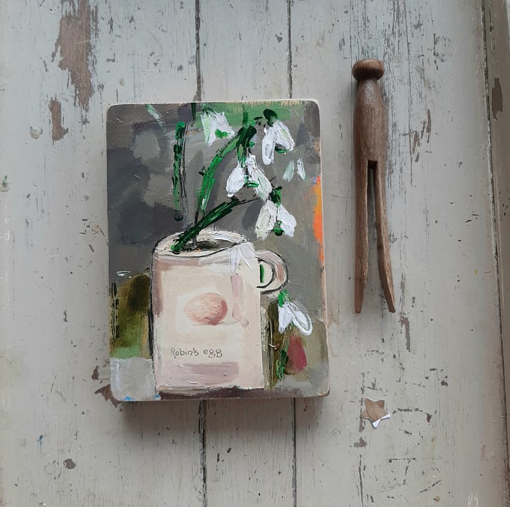 This contemporary still life flower painting in acrylic with mixed media collage. painted on thick reclaimed wood so rustic and modern. Measuring 16 cm tall 19cm wide. 1.5 cm deep. By artist Hestasinglewood aka bodkincreates on Instagram if you want to see more. Unframed but ready to hand with a hook in the back.