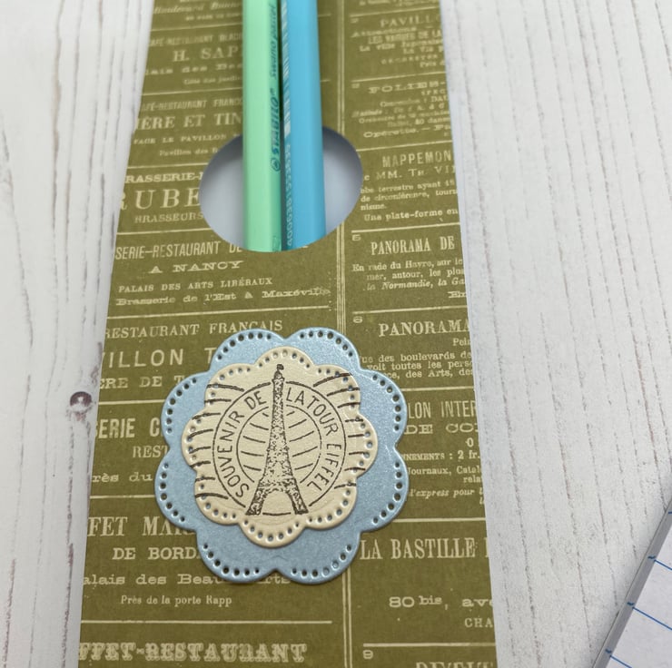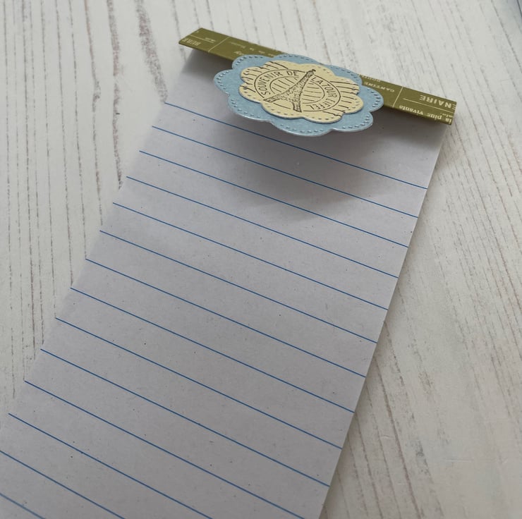 Slimline notebook with a Paris cover, set of two pencils with rubber ends and a handy match style book of sticky notes. A hand stamped postage marker mounted onto a scallop petal card added to each item. A lovely gift for a teacher, sleepover etc.