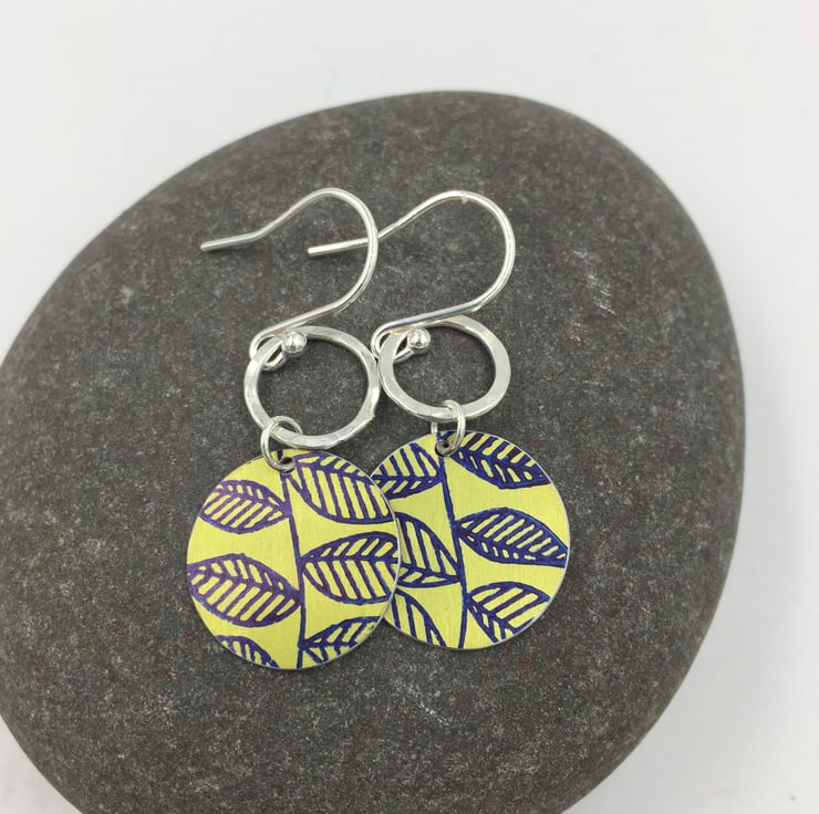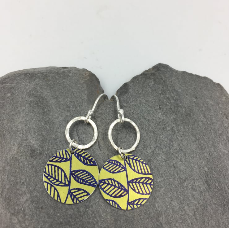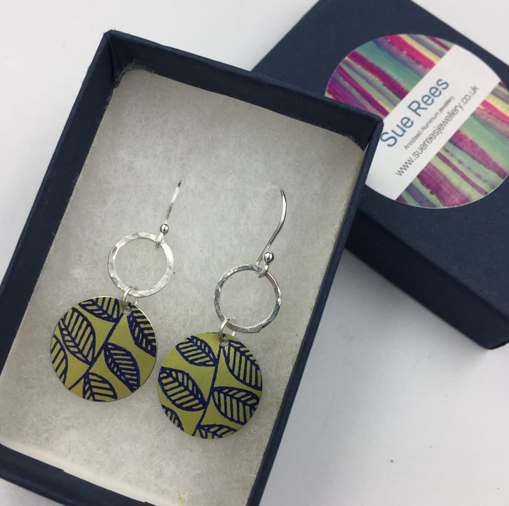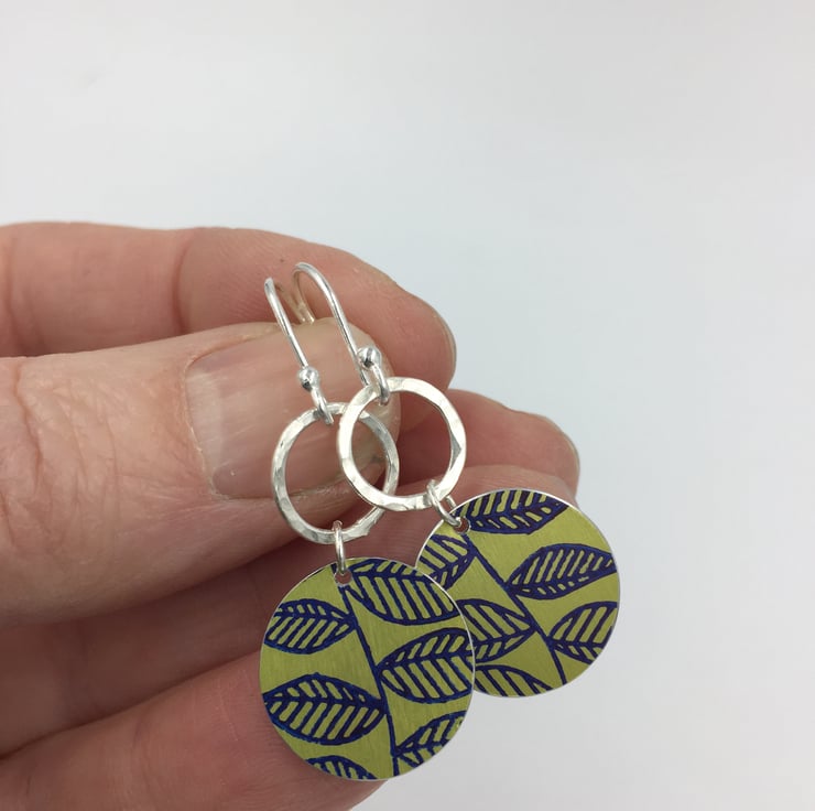 The anodised aluminium circles have been hand printed with a leaf design in navy blue, the metal was then dyed lime green. They hang from a recycled sterling silver rings that have been hammered to add texture.