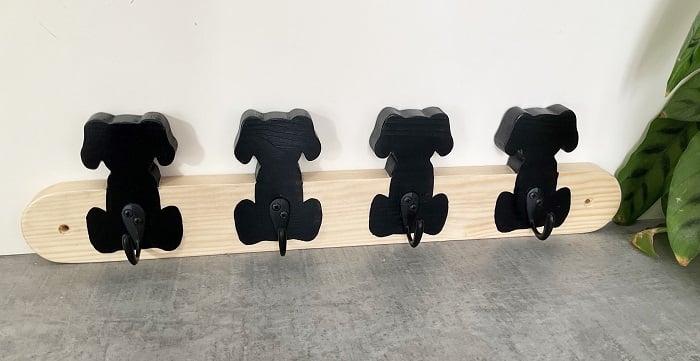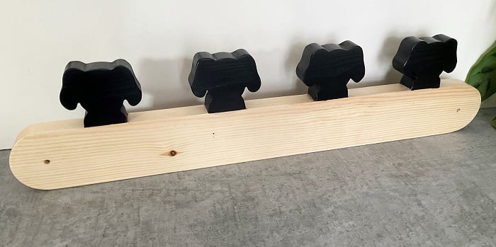 A fun and decorative coat rack for childs room or any where else in the house. The rack is functional with metal hooks for hanging clothes or other bits and pieces. The rack is made from single piece of premium grade pine, the corners gently rounded and finished in a hard wearing lacquer in a satin sheen.