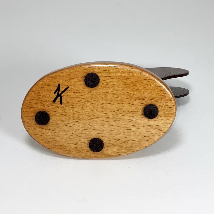 The stand is made from beechwood with walnut ears and black inlaid eyes. All the edges are rounded & smoothed and finished to a durable satin sheen. Four felt feet are mounted to on the bottom to prevent surface scratching.
