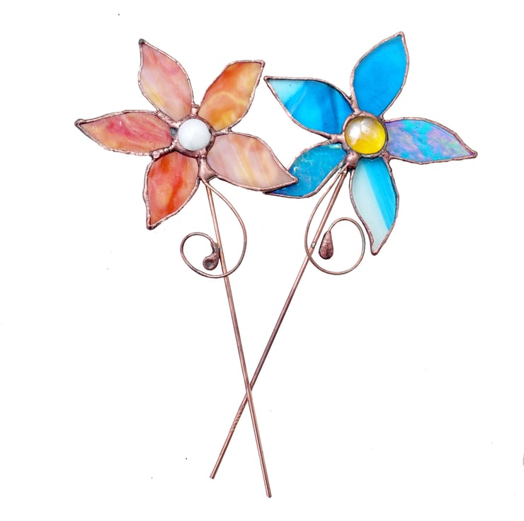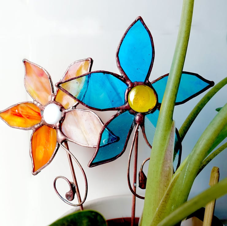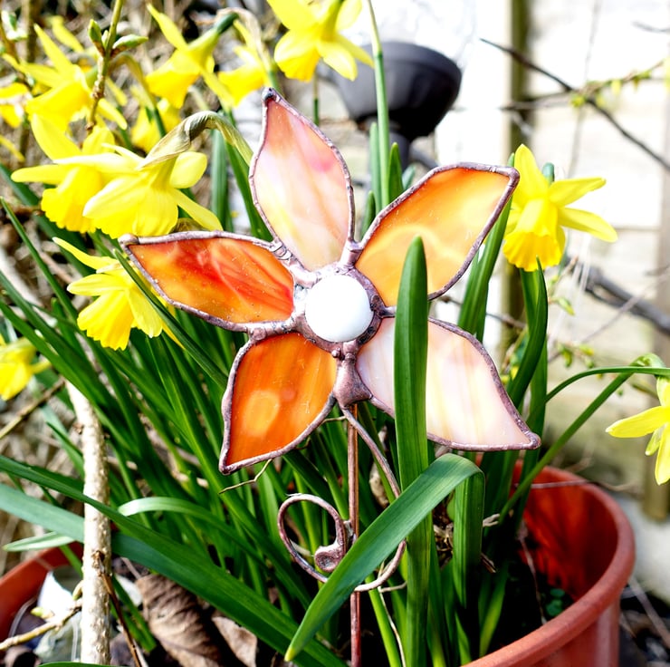Orange stained glass flower with copper wire detail on a copper stem. Ideal for indoor plant pots or outdoors in summer. The stem is not too long and fits nicely into most small to medium pots. The finish on the solder has been left rustic antique which will weather if outside.