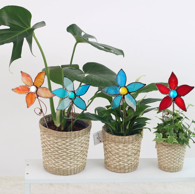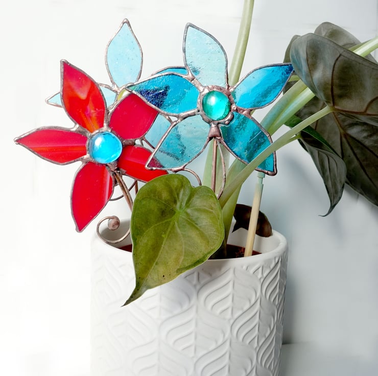 This red stained glass lily has a centre of deep turquoise blue and copper wire detail that is inspired by Art Nouveau. The main stem is made of strong slim copper that does not bend, and is strong enough to support the flower. The stems are not too long so that the flower can nestle in the greenery.