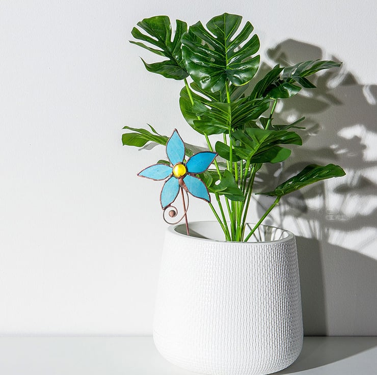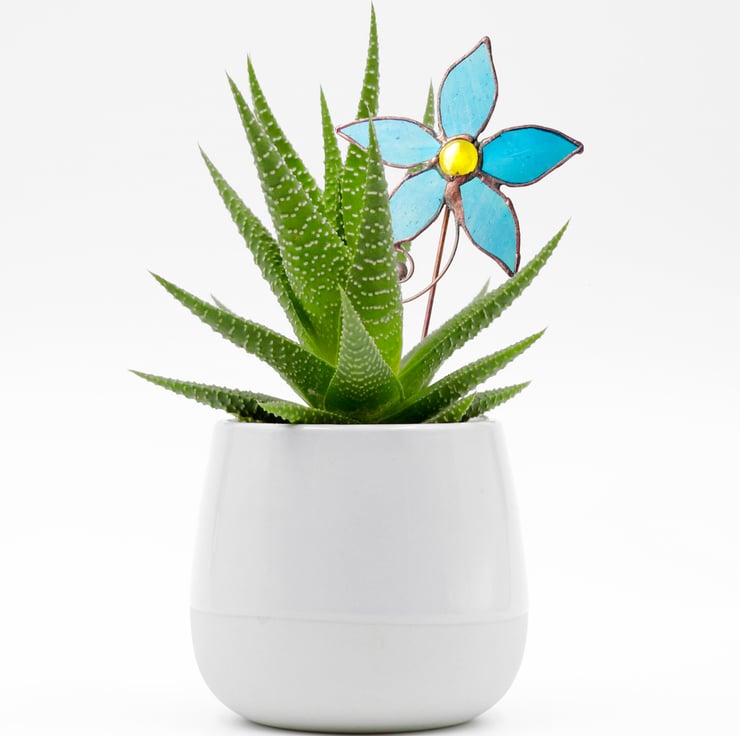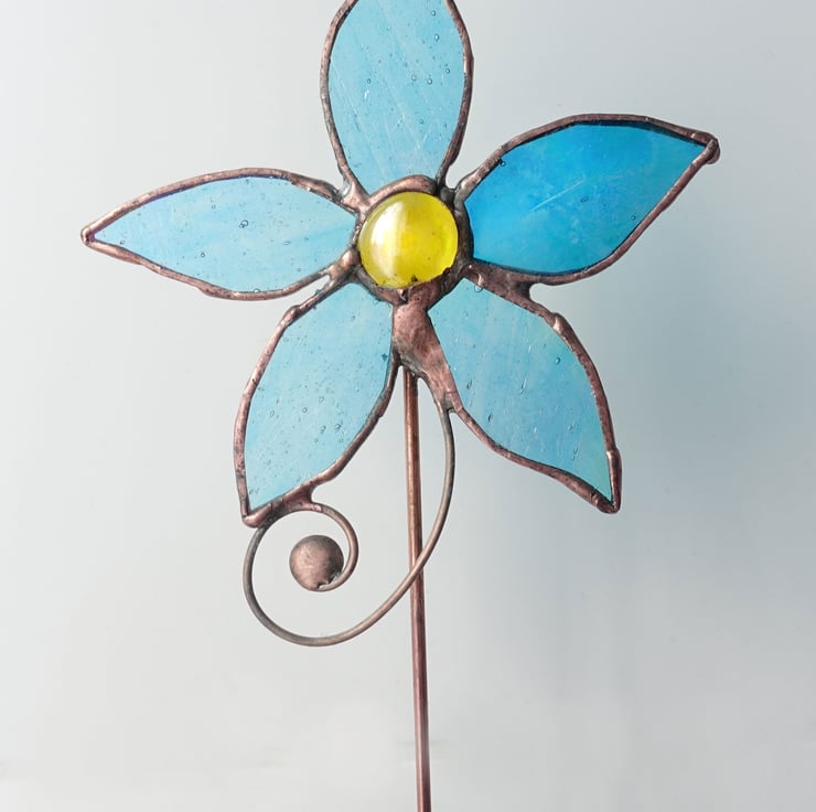 Stained Glass Pale turquoise blue iridescent flower with copper wire detail on a copper stem. Ideal for indoor plant pots or outdoors in summer. The stem is not too long and fits nicely into most small to medium pots. The finish on the solder has been left rustic antique which will weather if outside.
