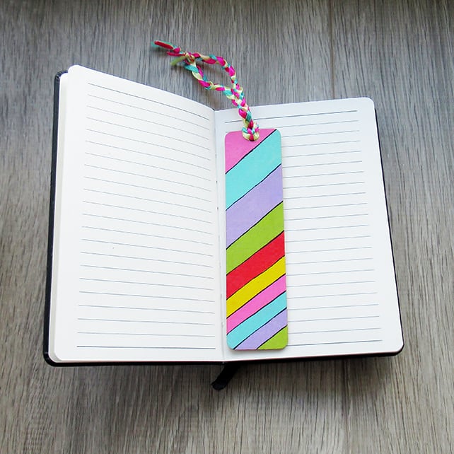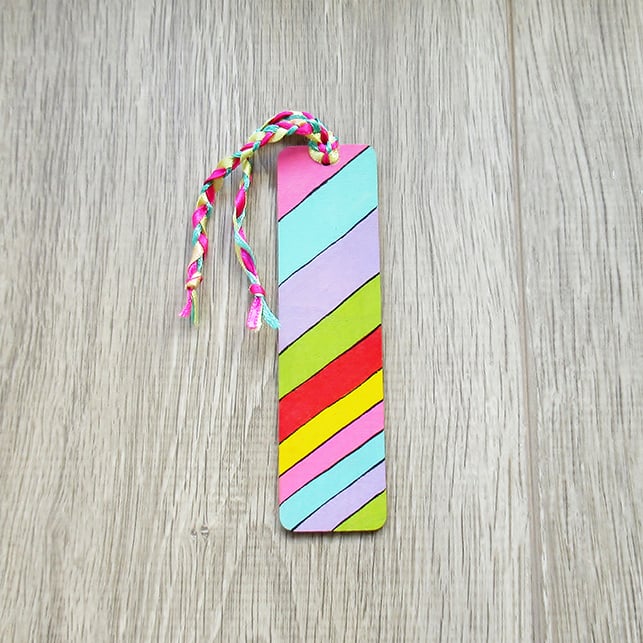Hand painted using acrylic paints in bright red, yellow, lilac, lime green, turquoise and pink in a diagonal stripe effect design. On the bookmarks other side it has a little rainbow and the hand written text added by pyrography ‘The future belongs to those who Dream’ . A set of horizontal coloured stripes have been added at the bottom.