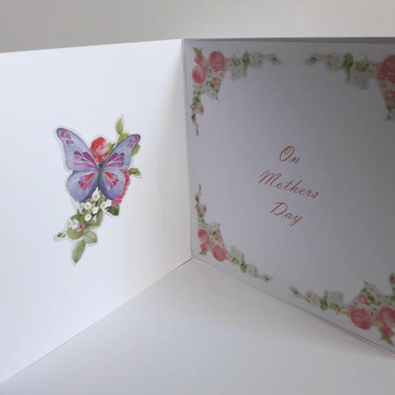 This 17cm square mother's day card has a purple and pink butterfly on pink roses and blossom flowers, surrounded by a green die cut leafy frame on a white linen effect diamond.