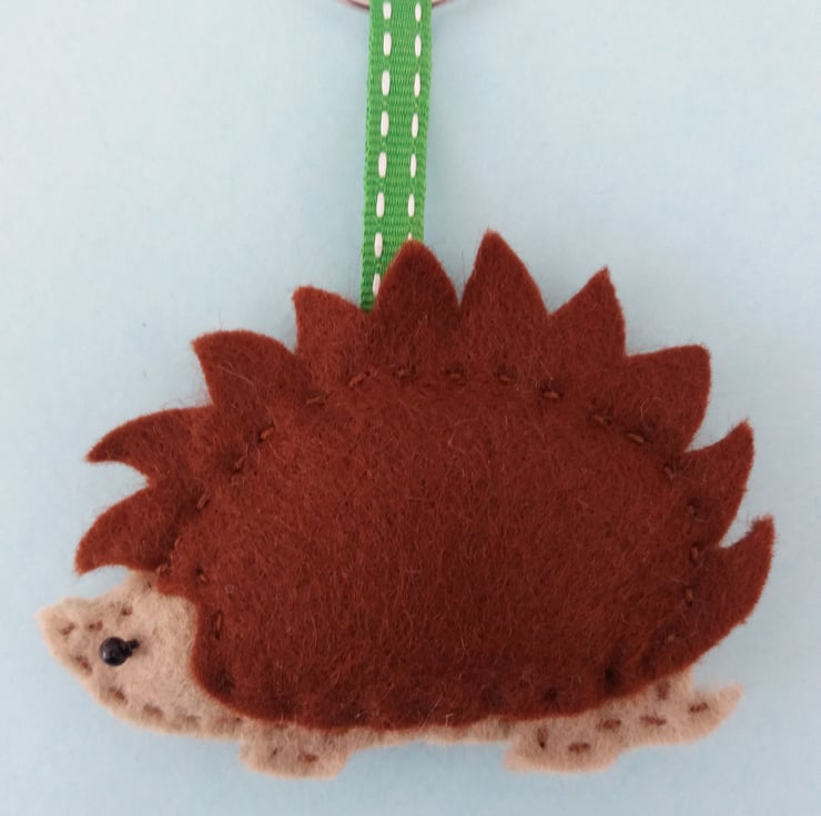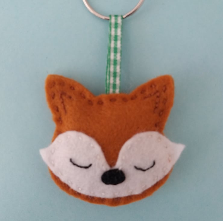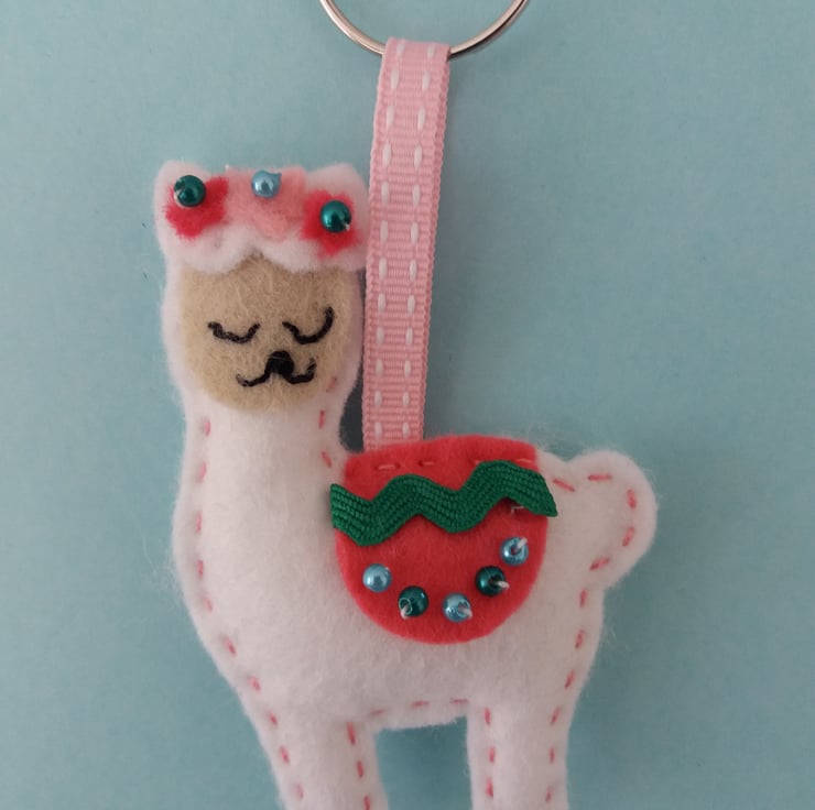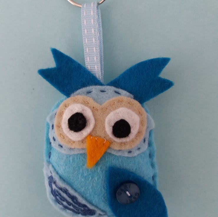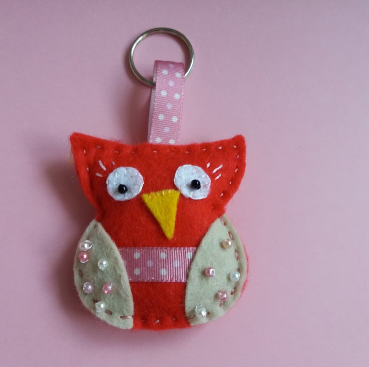 Hand-sewn felt bag charm or key ring decorated with ribbons, beads or buttons or hand-embroidery.