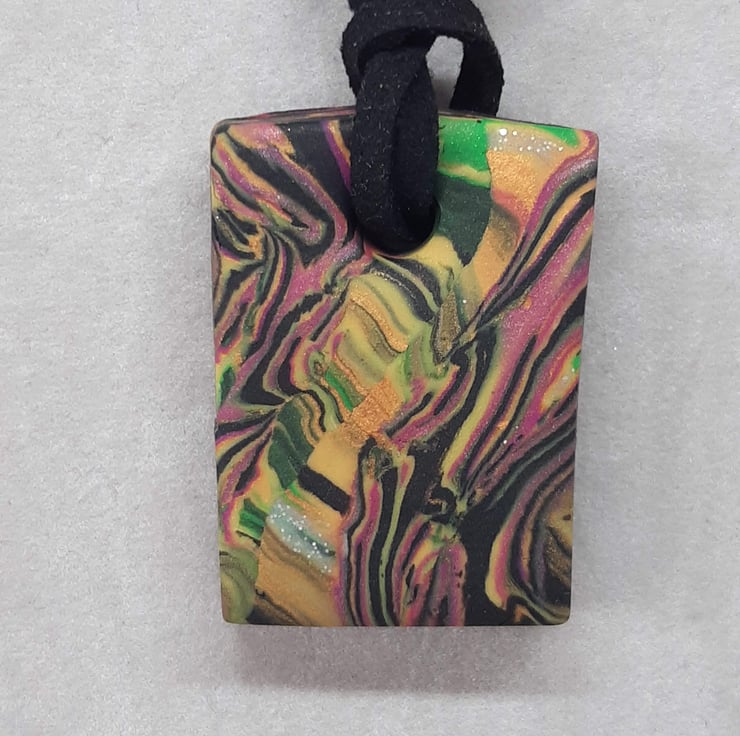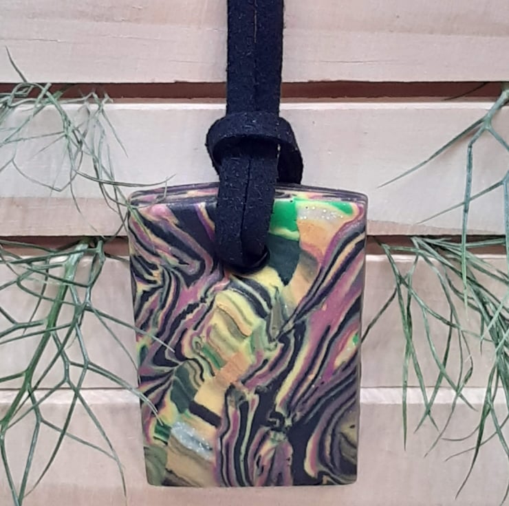 This multi-coloured pendant has a dark green soft faux suede cord, extending to 29cm/approx 11.5 inches with a sliding slip knot for easy wear. A longer cord can be provided on request.