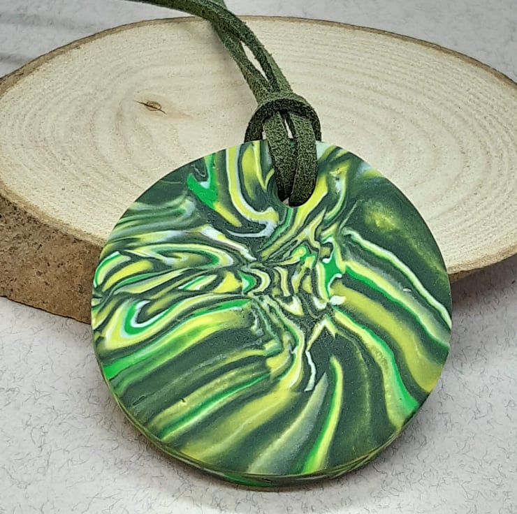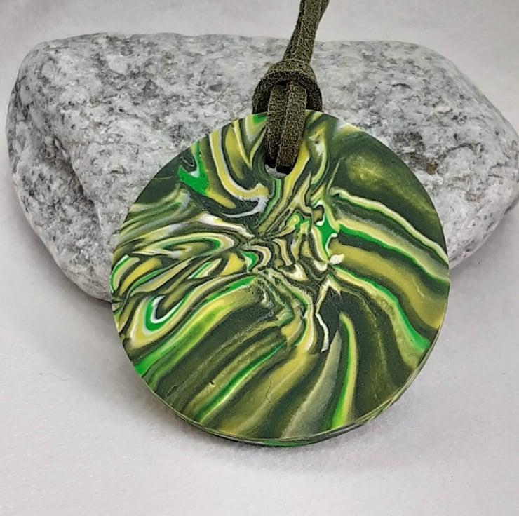 A bright green round pendant handmade from a blend of forest green, bright green and silver polymer clay to create a unique pattern with a touch of sparkle.