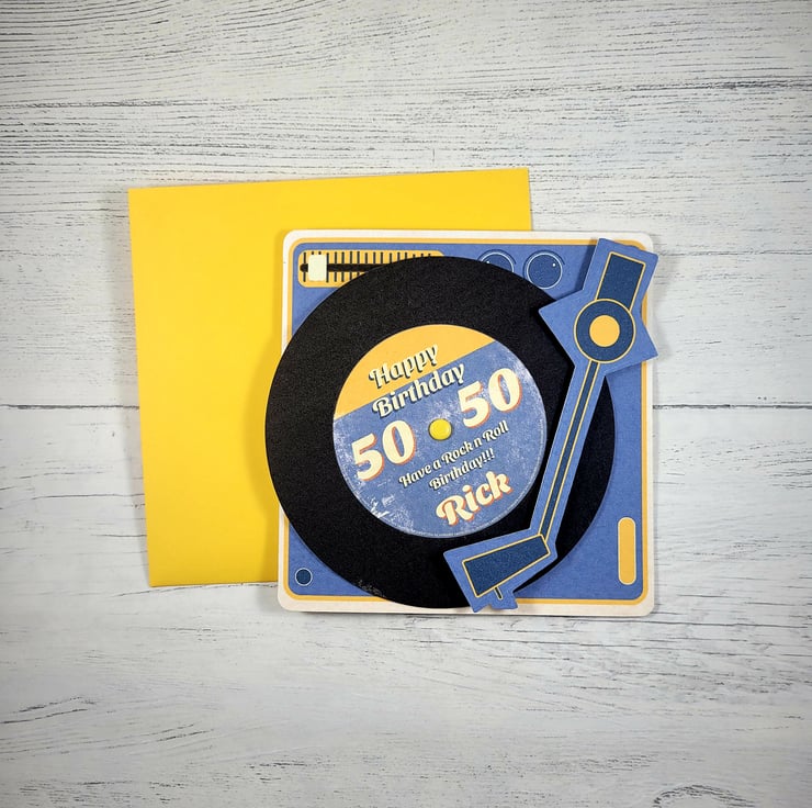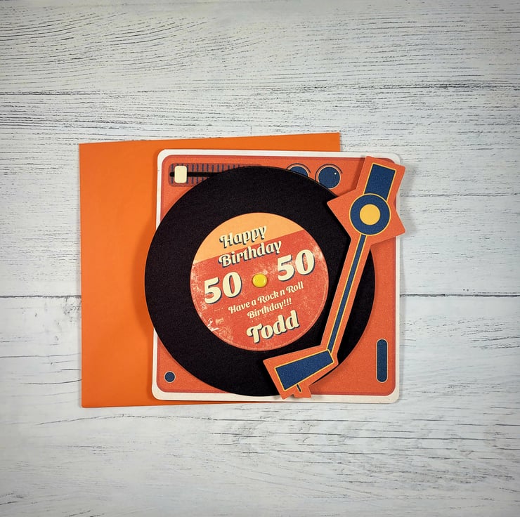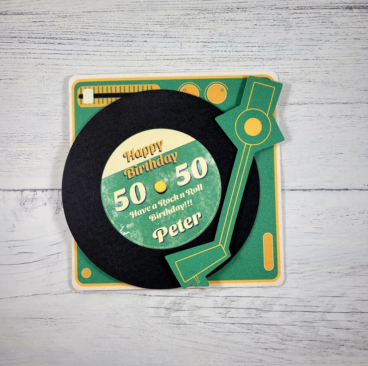 This custom retro spinning record player is a great quirky birthday card for any music loving dad, grandad, husband or boyfriend