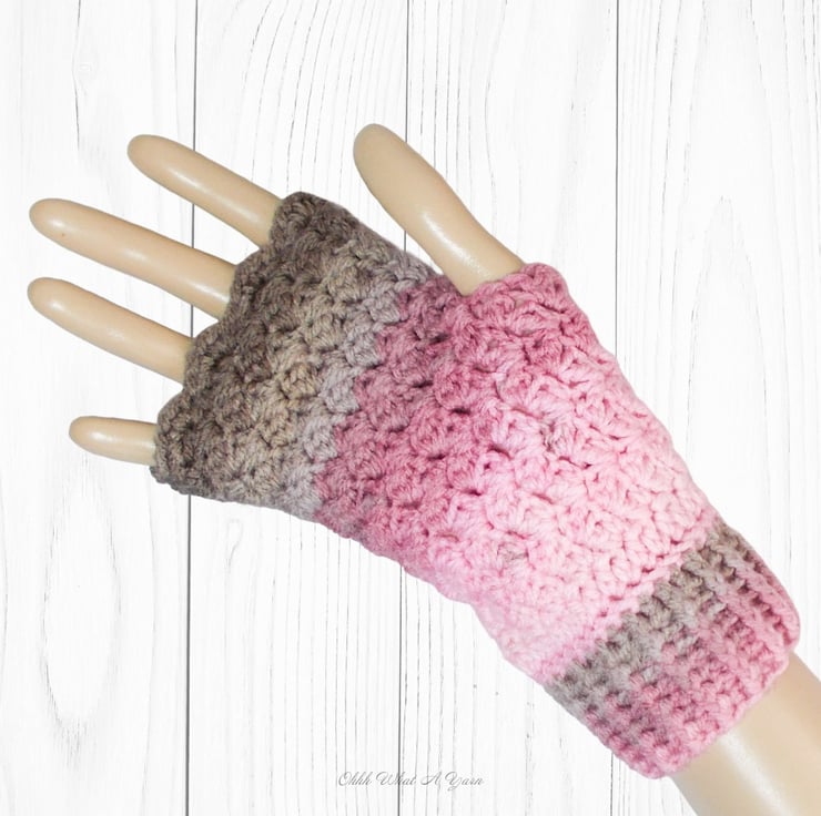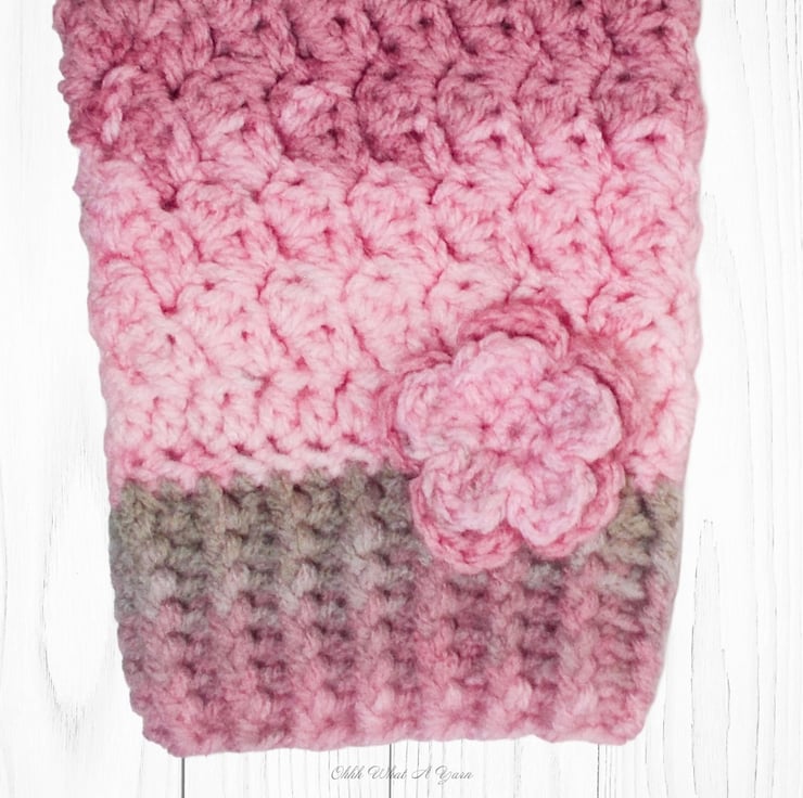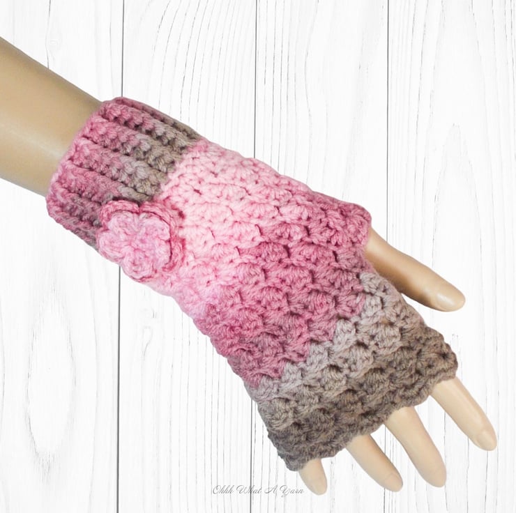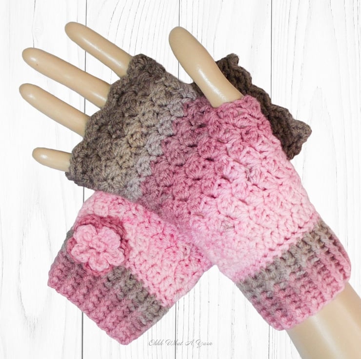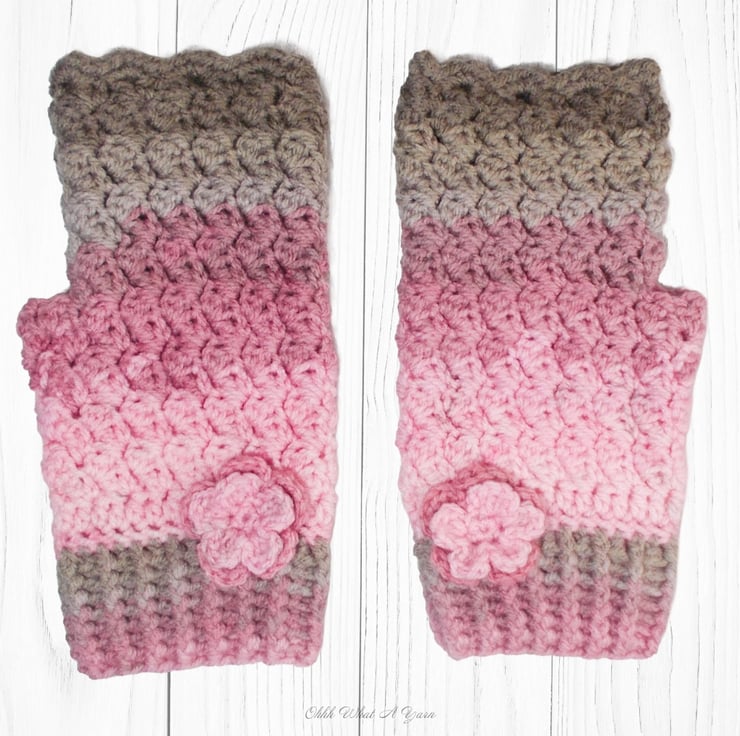 They have been crocheted using 100% acrylic colour changing yarn in shades of pinks and browns in a pretty textured stitch. They have a ribbed cuff and a little two layered flower for decoration.