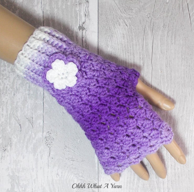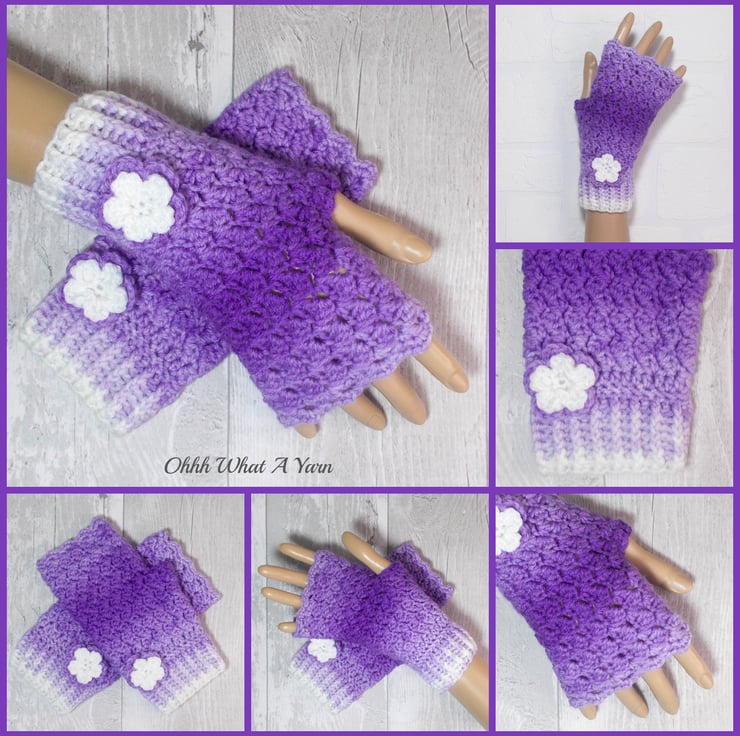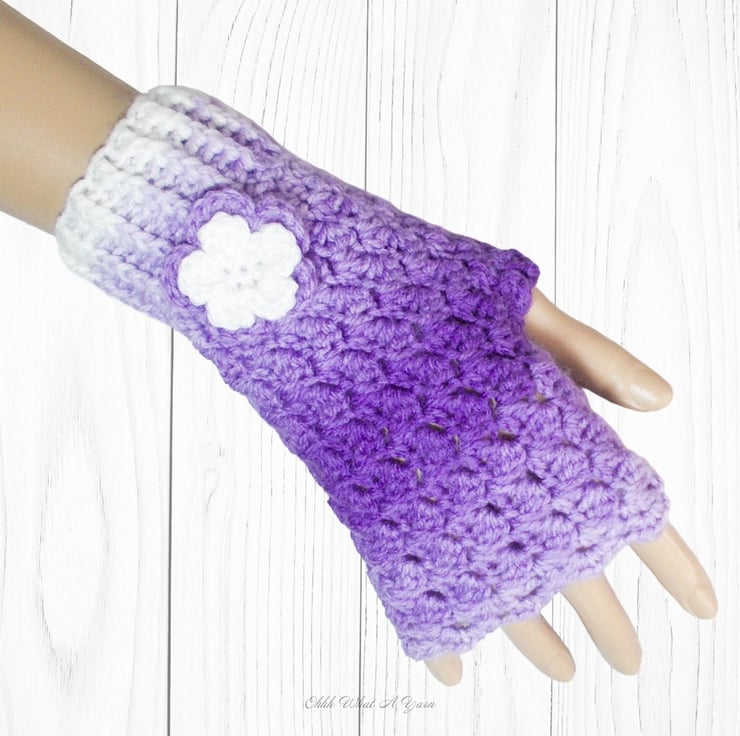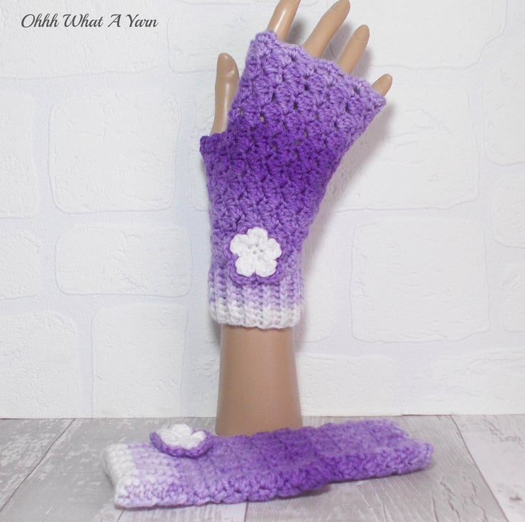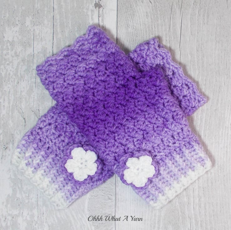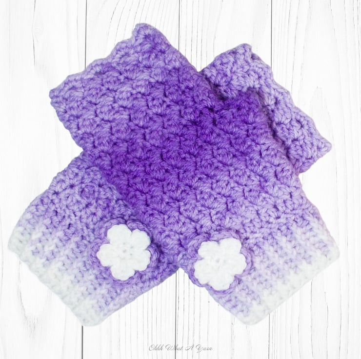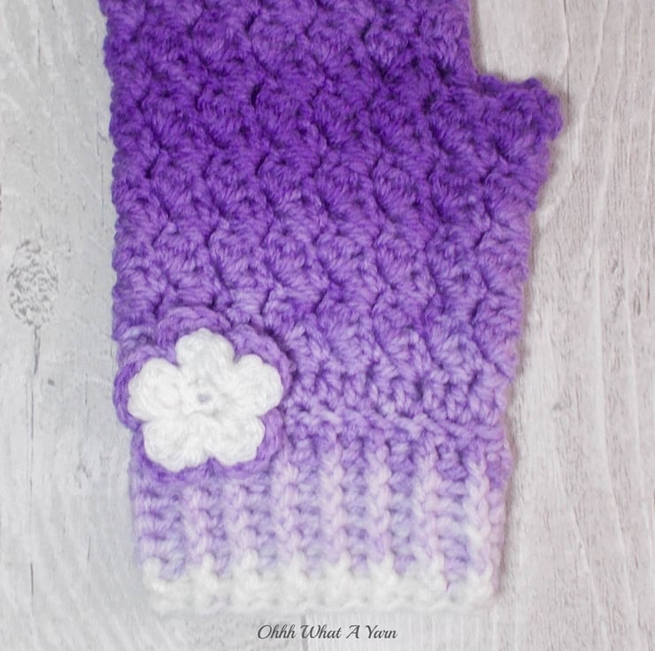 They have been crocheted using 100% acrylic colour changing yarn in shades of purples, lilacs and whites in a pretty textured stitch. They have a ribbed cuff and a little two layered flower for decoration.
