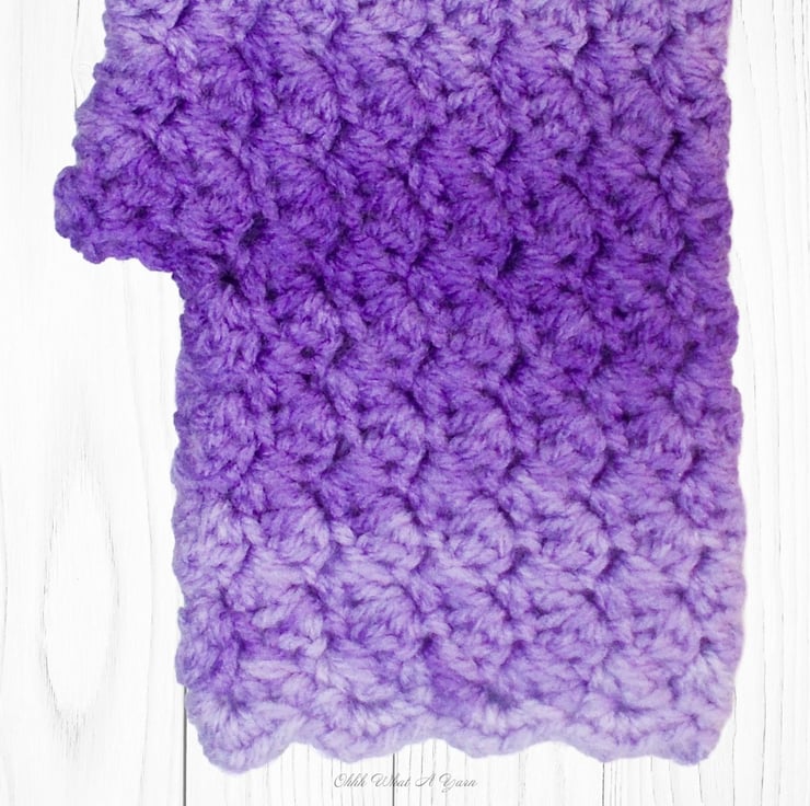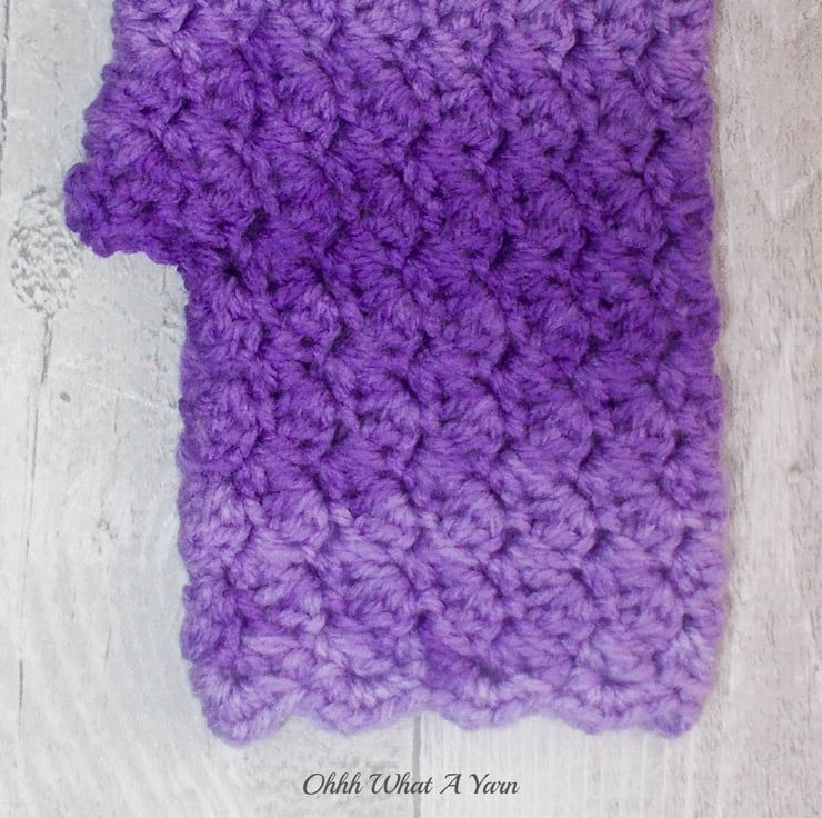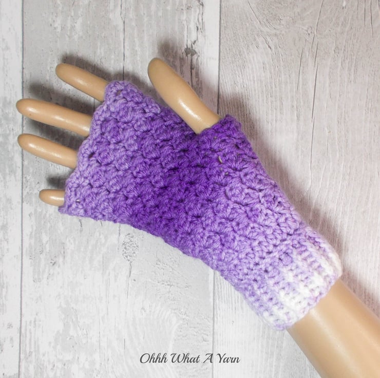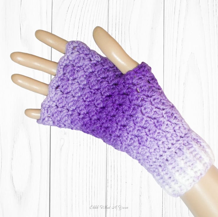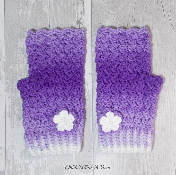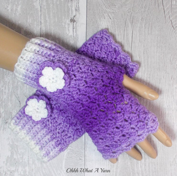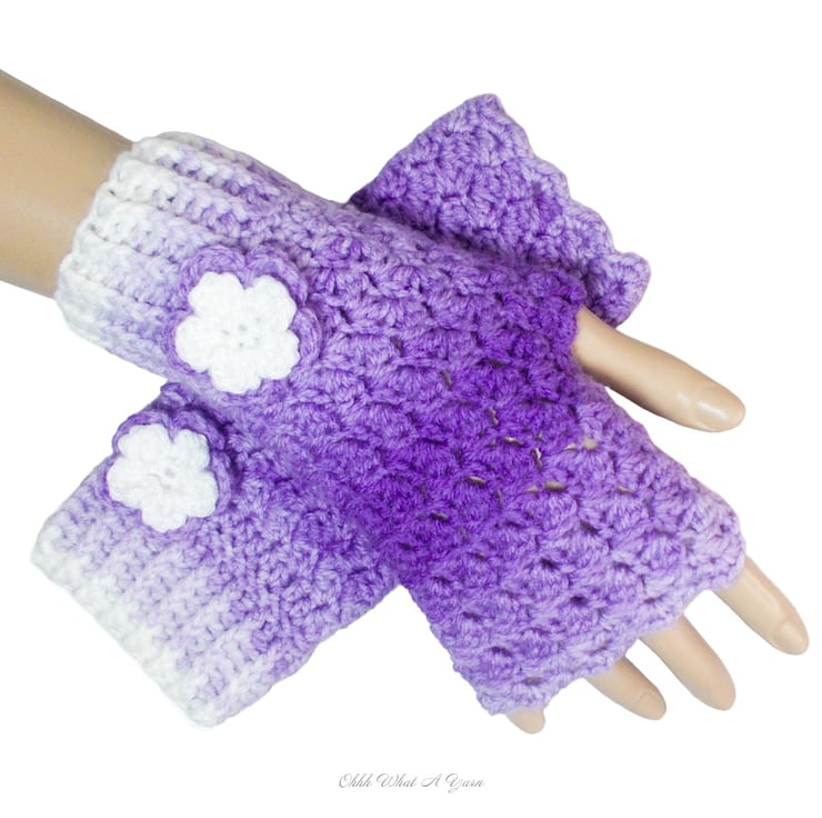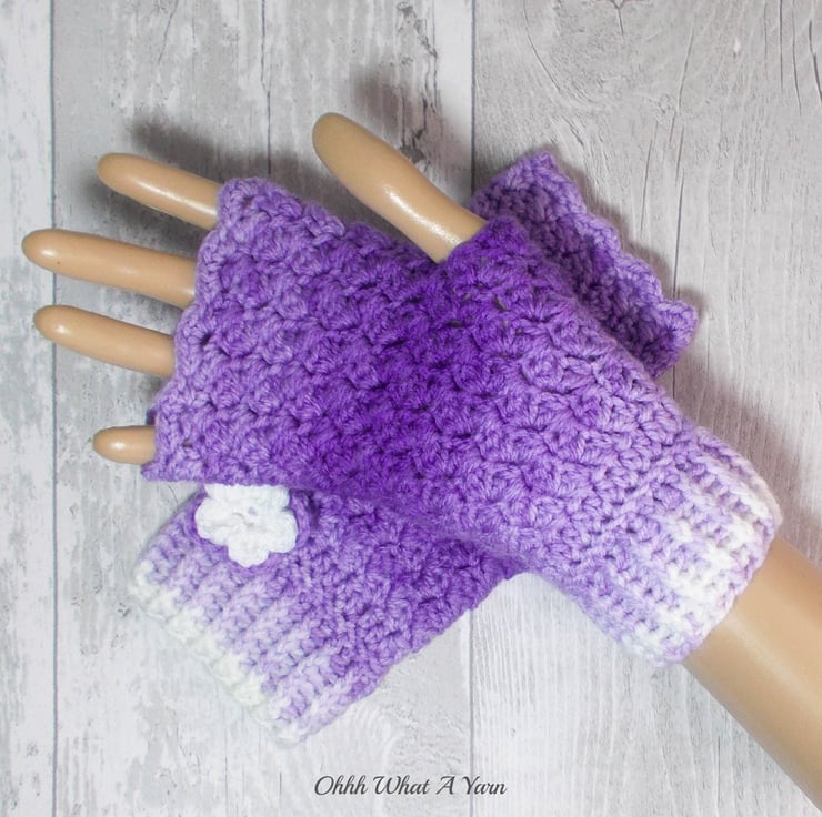 They have been crocheted using 100% acrylic colour changing yarn in shades of purples, lilacs and whites in a pretty textured stitch. They have a ribbed cuff and a little two layered flower for decoration.