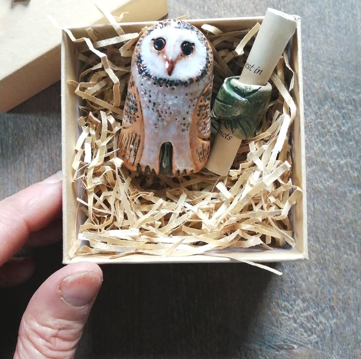 Each owl is similair but unique, due to slight variations between each one being hand modelled and crafted, complete with story scroll held together with clay leaf.