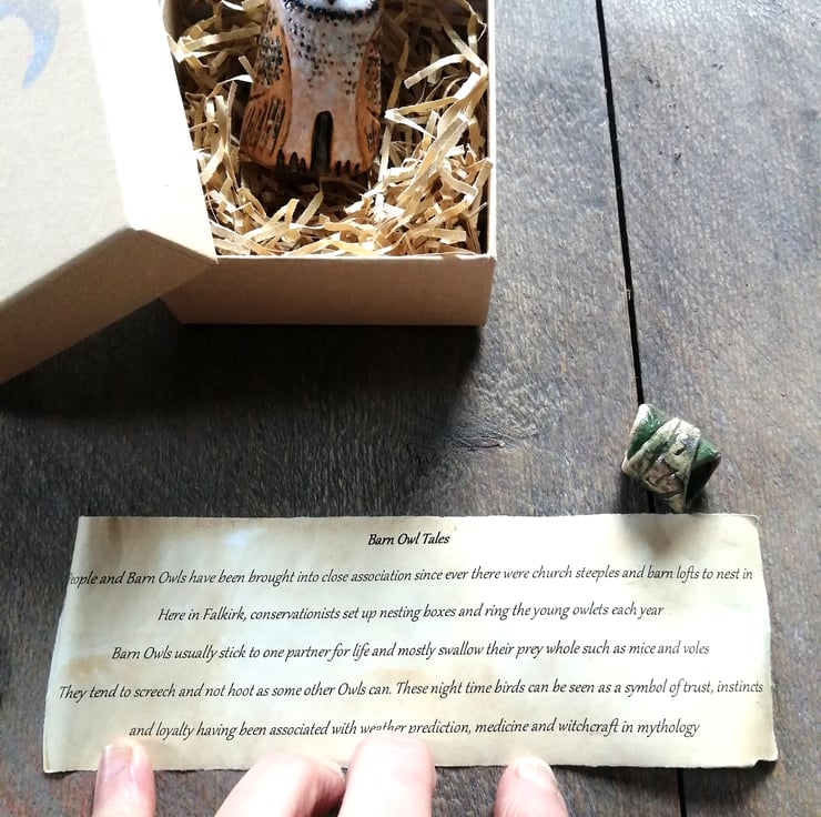This small sculpture comes with a scroll telling a short story about Barn Owl facts and Folklore, inserted into a pottery leaf.