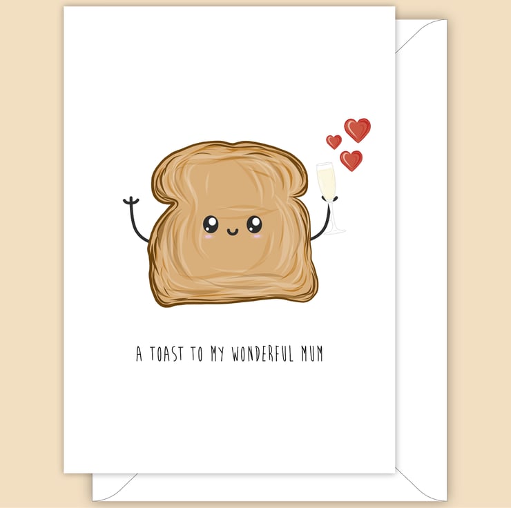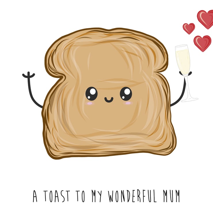 An A6 (folded) birthday card for Mum or Mother's Day card made with 350gsm, matt FSC card depicting a hand drawn slice of toast holding up a glass of chapagnes.