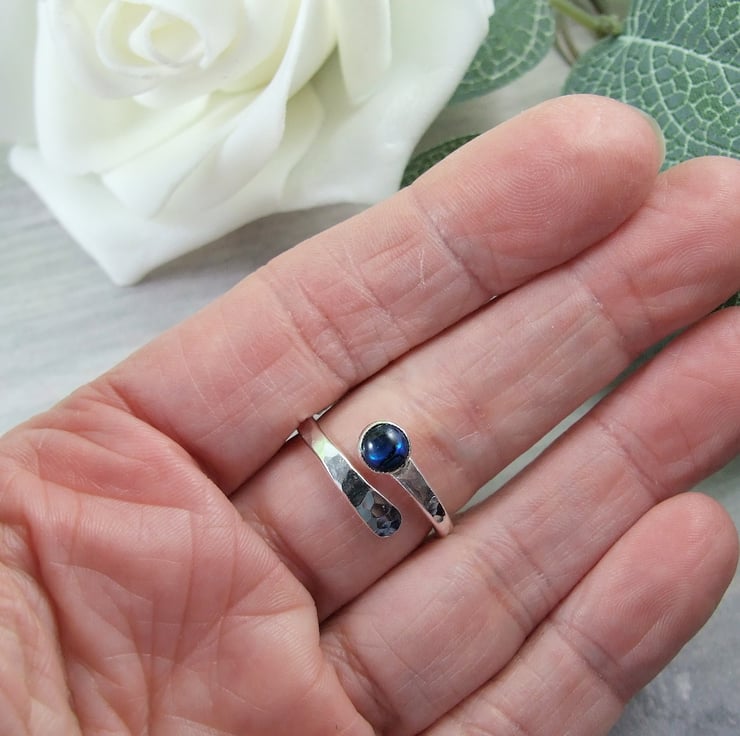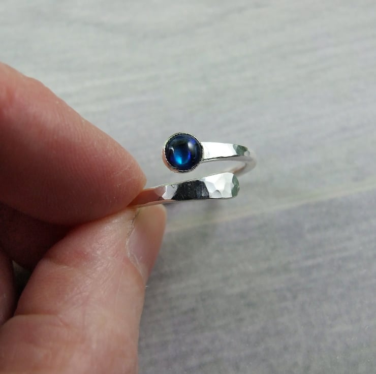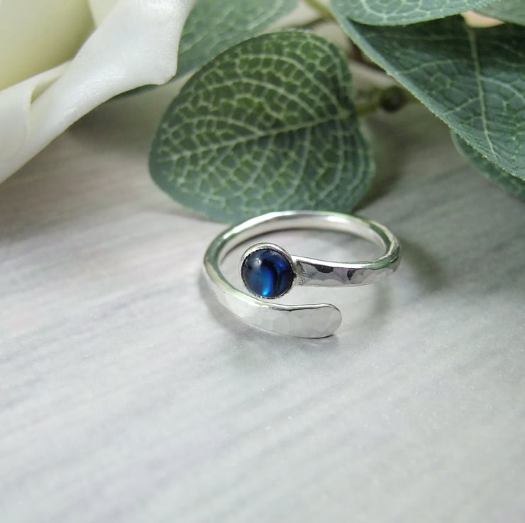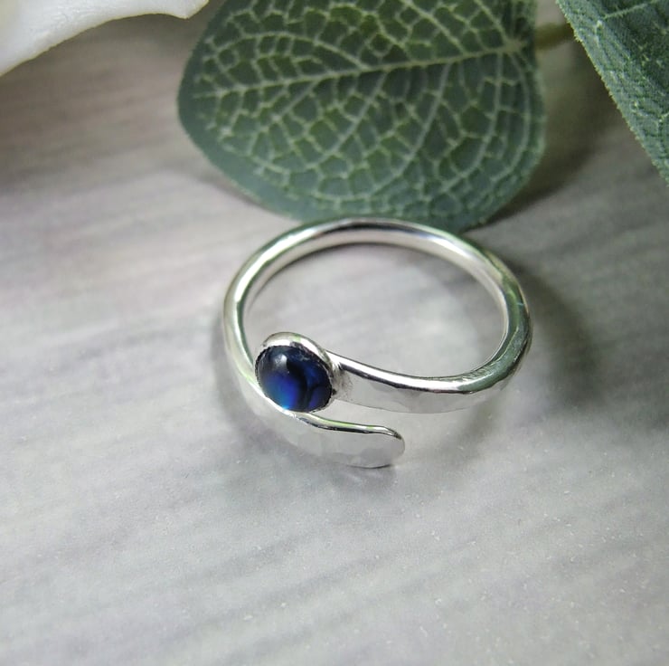 Hand Forged Sterling Silver Ring with Blue Paua Shell Gemstone. Wrap around adjustable fit with hammered finish. Currently sized at UK P but I can adjust up or down a size, just let me know in the notes to sellers box if you would ike it adjusted for you.