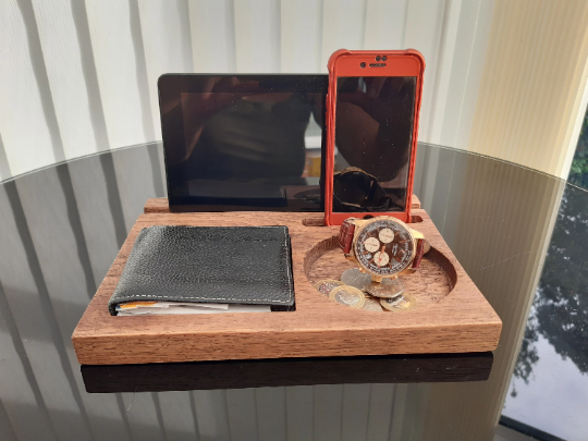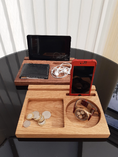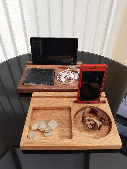 This beautiful bedside tidy, desk organiser is hand made from solid oak, It is able to hold up to a 10 inch tablet, and any make of phone both with space to use your charger. There is room for a wallet or change, and even a space for your watch or jewellery.