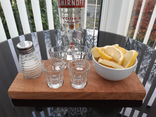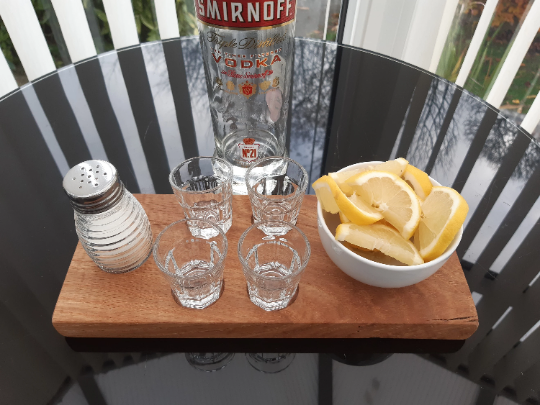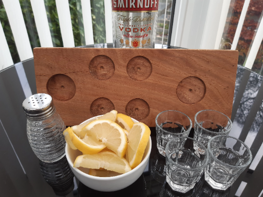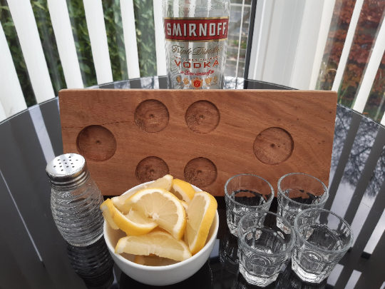 This beautiful solid oak shot glass serving tray is an ideal way to serve your drinks, in a unique design the set also includes 4 glasses, salt shaker and bowl, so all you need to do is supply your favorite shot.