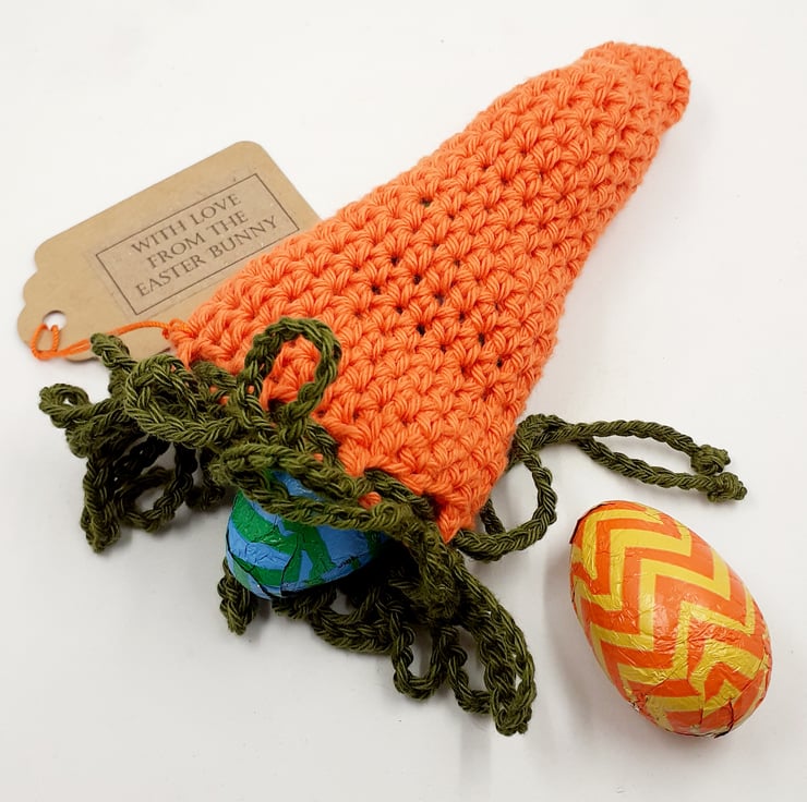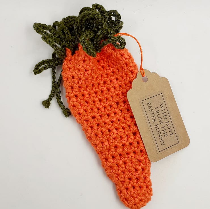 All ready to hold a gift from the Easter Bunny, this carroty treat pouch is crocheted in cotton and measures approximately 17 cm from the top of its green leaves to the bottom of the carrot. There is a green crochet drawstring and the tag reads 'With love from the Easter Bunny ' although I am very happy to exchange this tag for one with wording of your choice. The gift bag comes to you wrapped in tissue in a labelled PIP ( Postage in Proportion) box. It is supplied empty and can be filled with small chocolate eggs or with money if the Easter Bunny is feeling generous!
