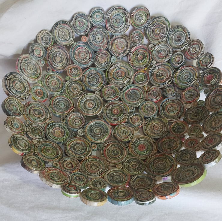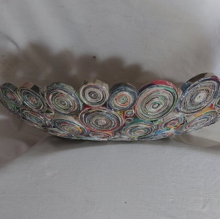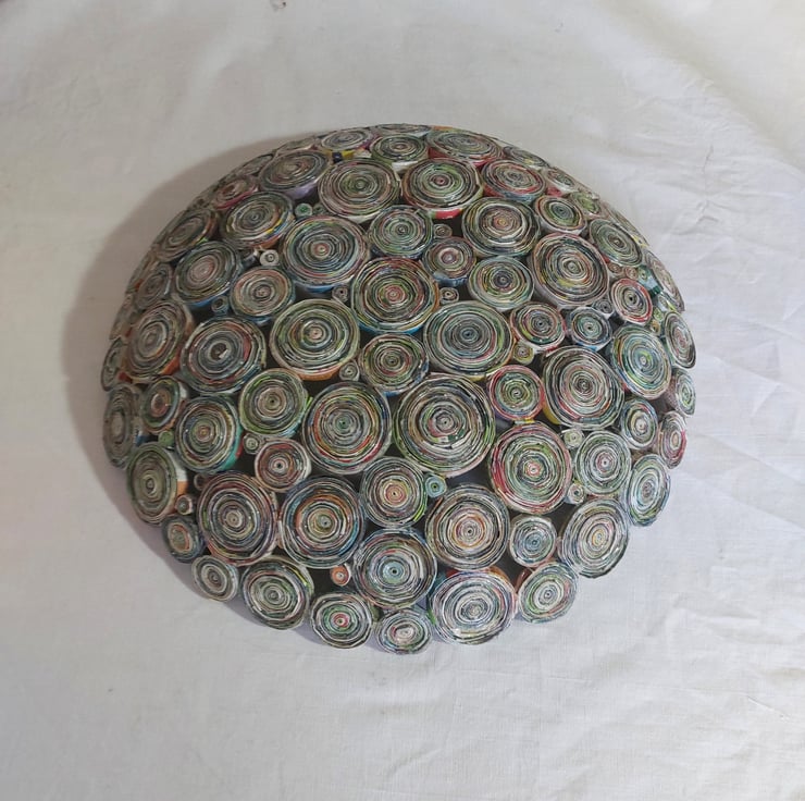 Hand crafted piece made using recycled magazine paper.