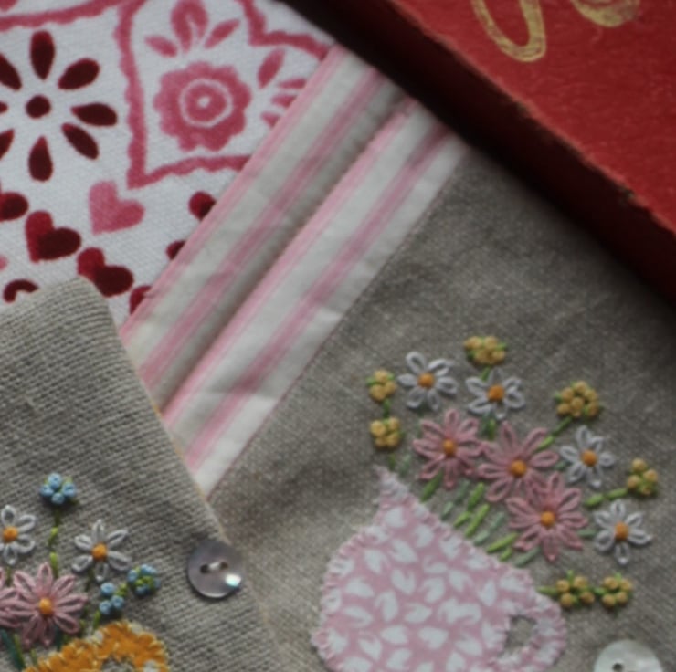 Sweet little needle case featuring an appliqued jug motif with hand embroidered flowers on the front, and Emma Bridgewater 'Sampler' fabric on the back.