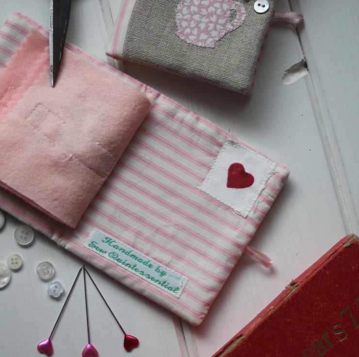 The needle case is lined with pink and white ticking stripe cotton fabric and has a layer of cotton batting to give a lightly padded effect. There are two pieces of pink felt giving four 'pages' which have been decorated with snippets of leftover ribbon. The case is fastened with a button and ribbon loop.