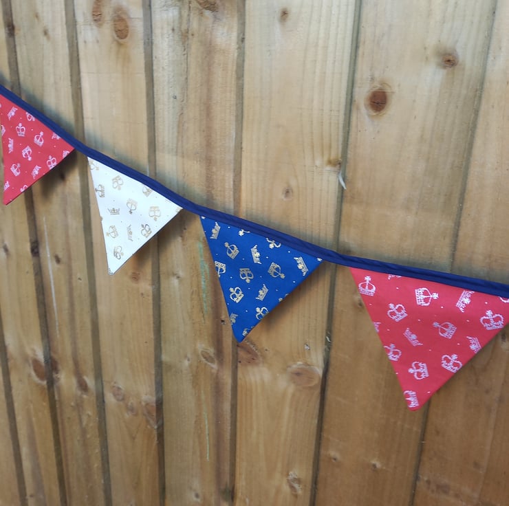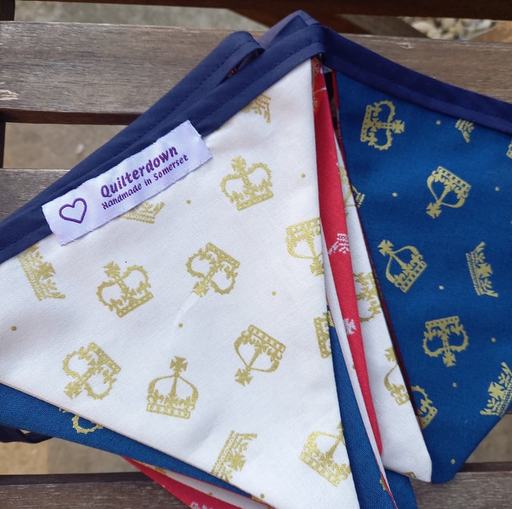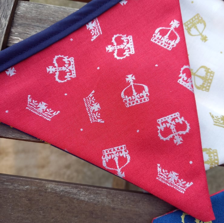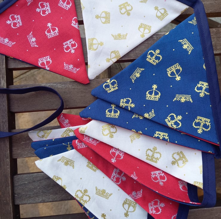 Coronation bunting. Red, white and blue bunting with gold and silver crowns,with navy blue binding.