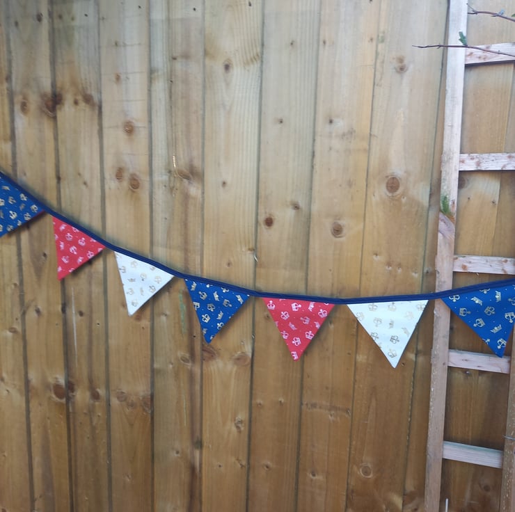 Approx 2.5 m of bunting with 12 "flags", which measure 15cm from the top of binding to the point.